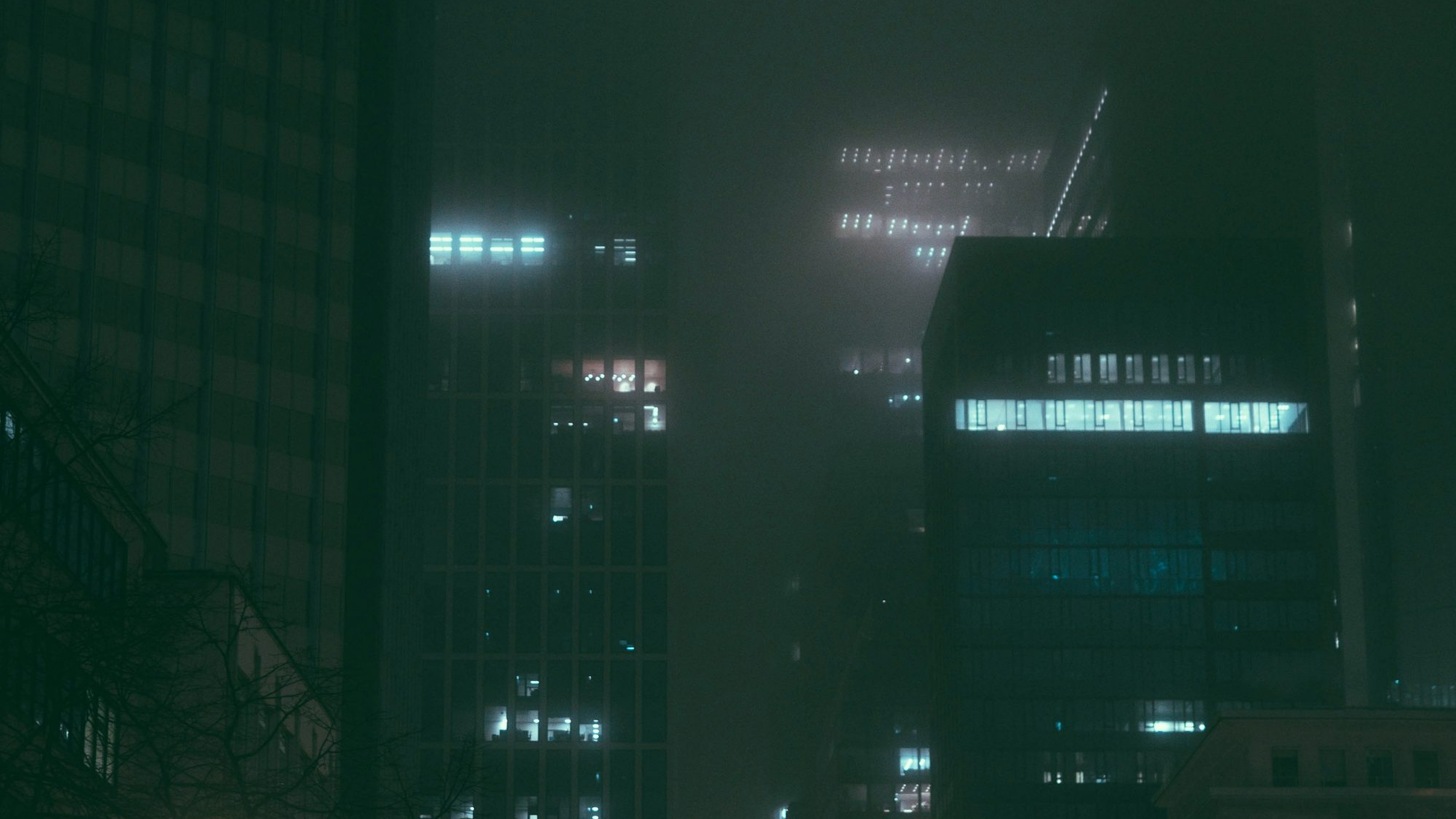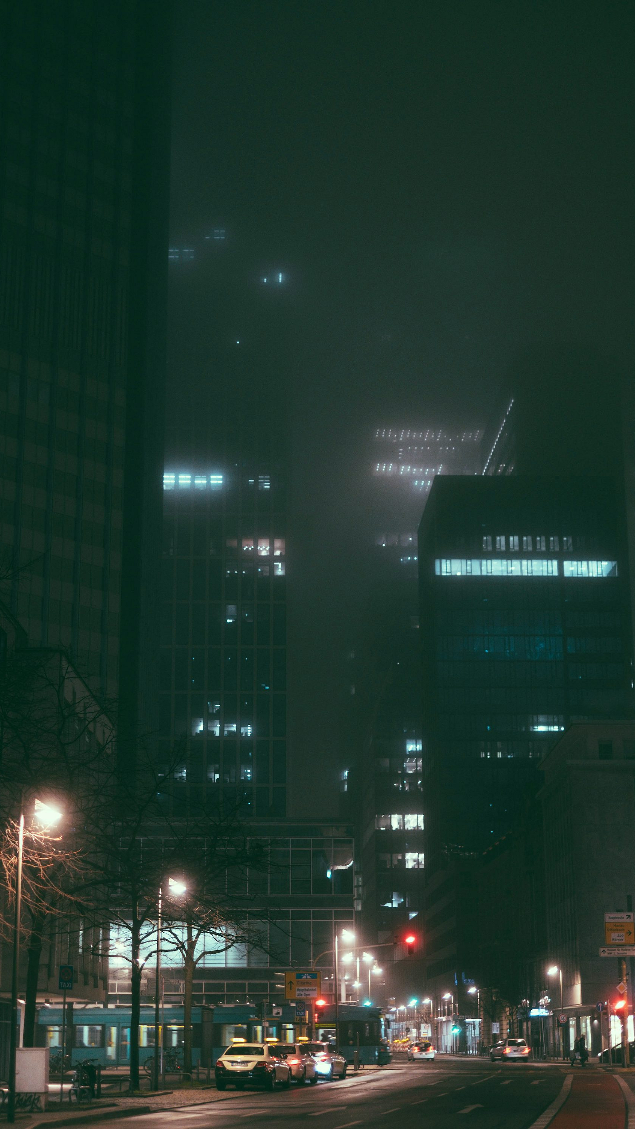 a city street at night with tall buildings