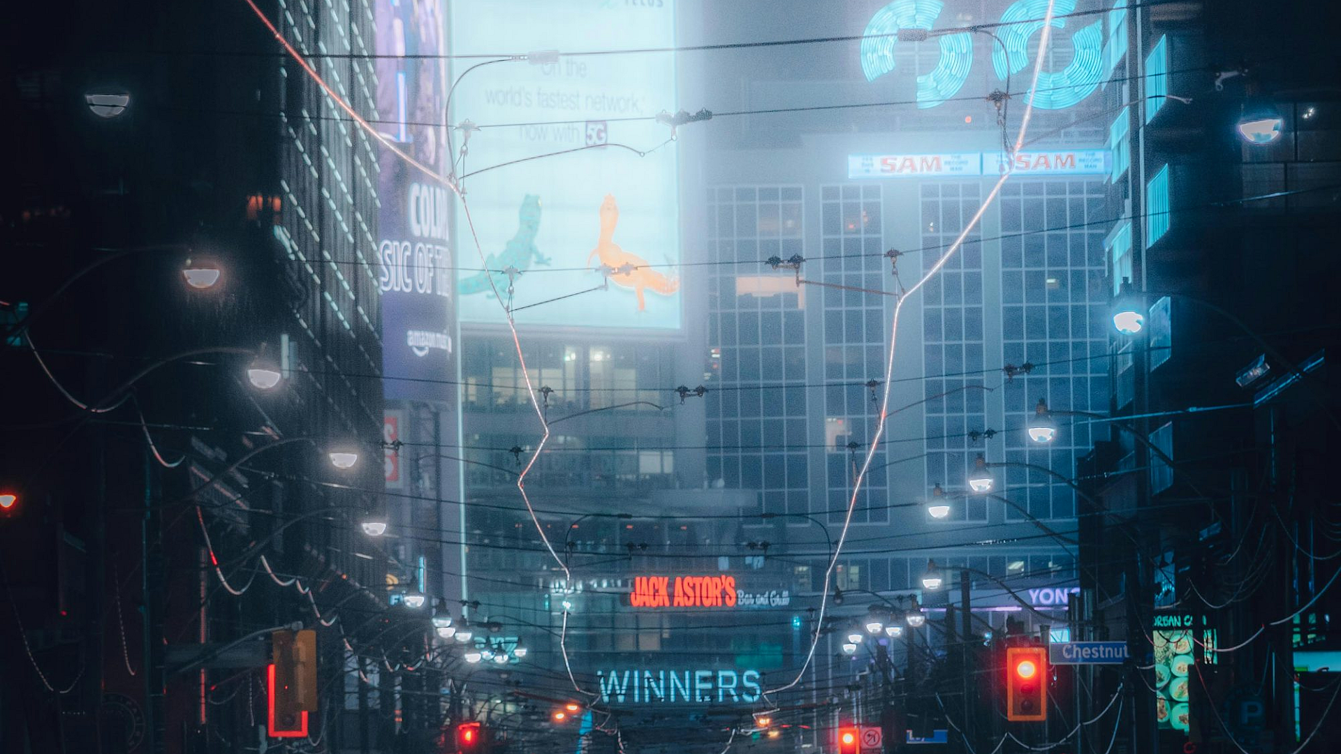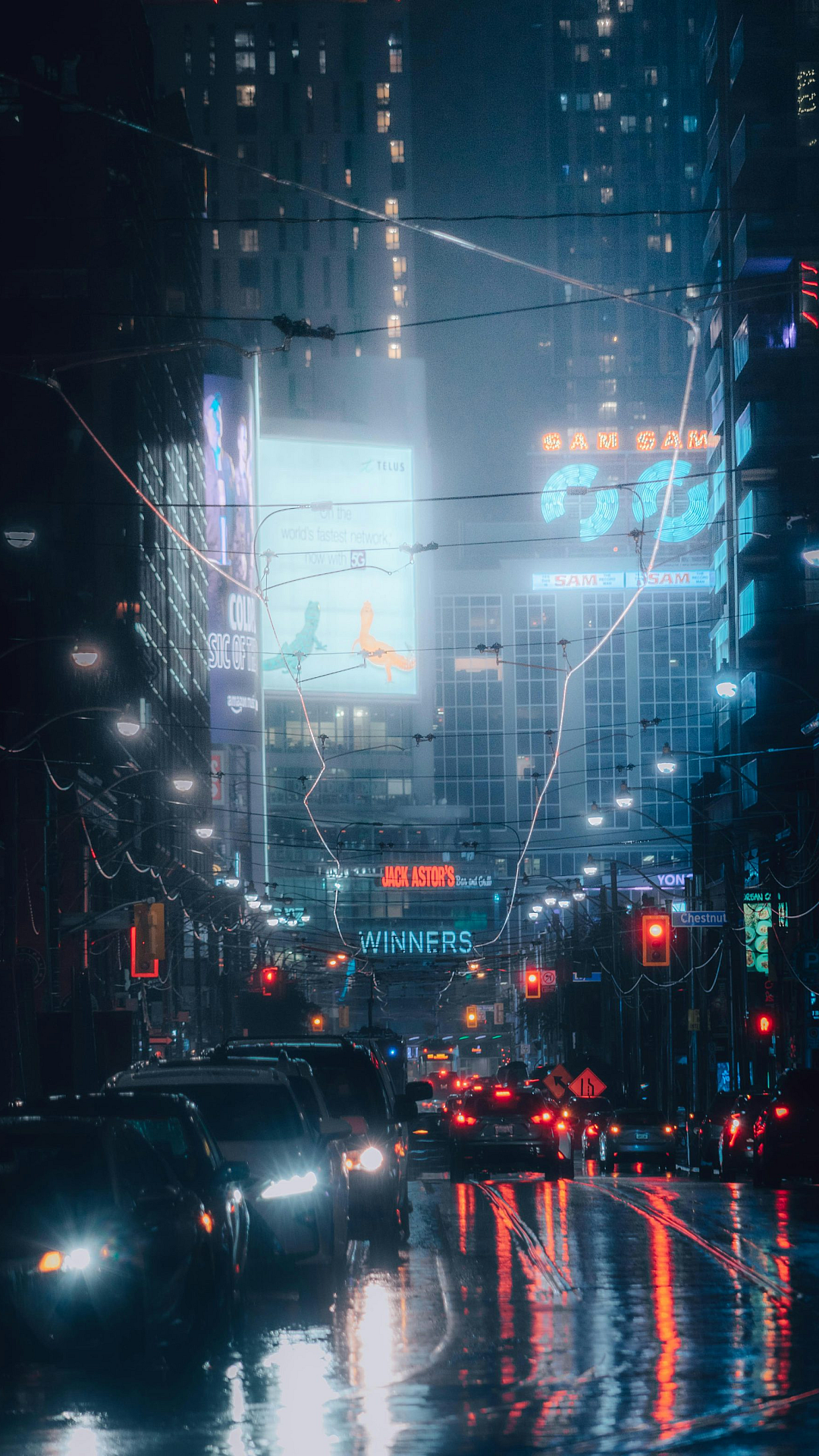 Experience the vibrant energy of a bustling city at night. This wallpaper captures the dazzling lights and heavy traffic of a busy urban street.