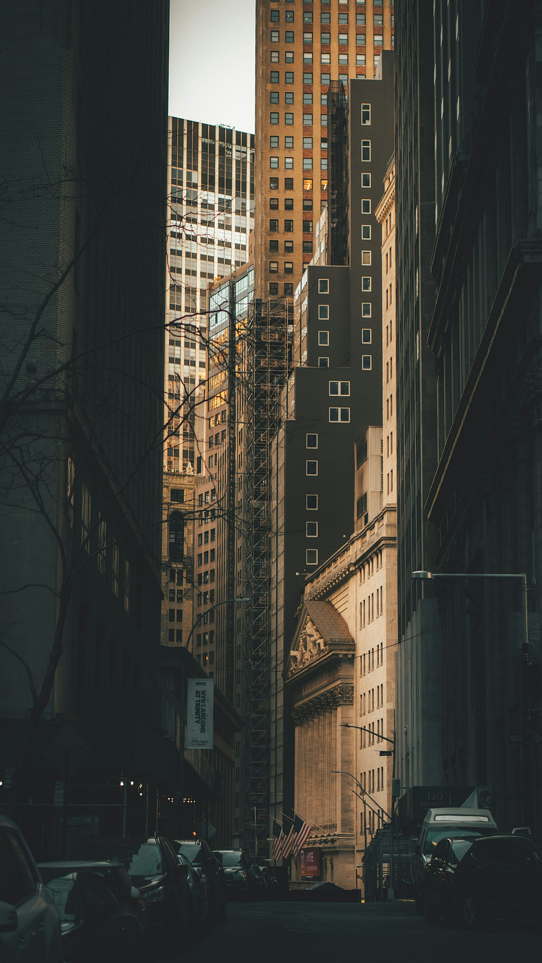 This wallpaper features a stunning view of a city street, with imposing tall buildings forming a dramatic backdrop. Perfect for a modern aesthetic.