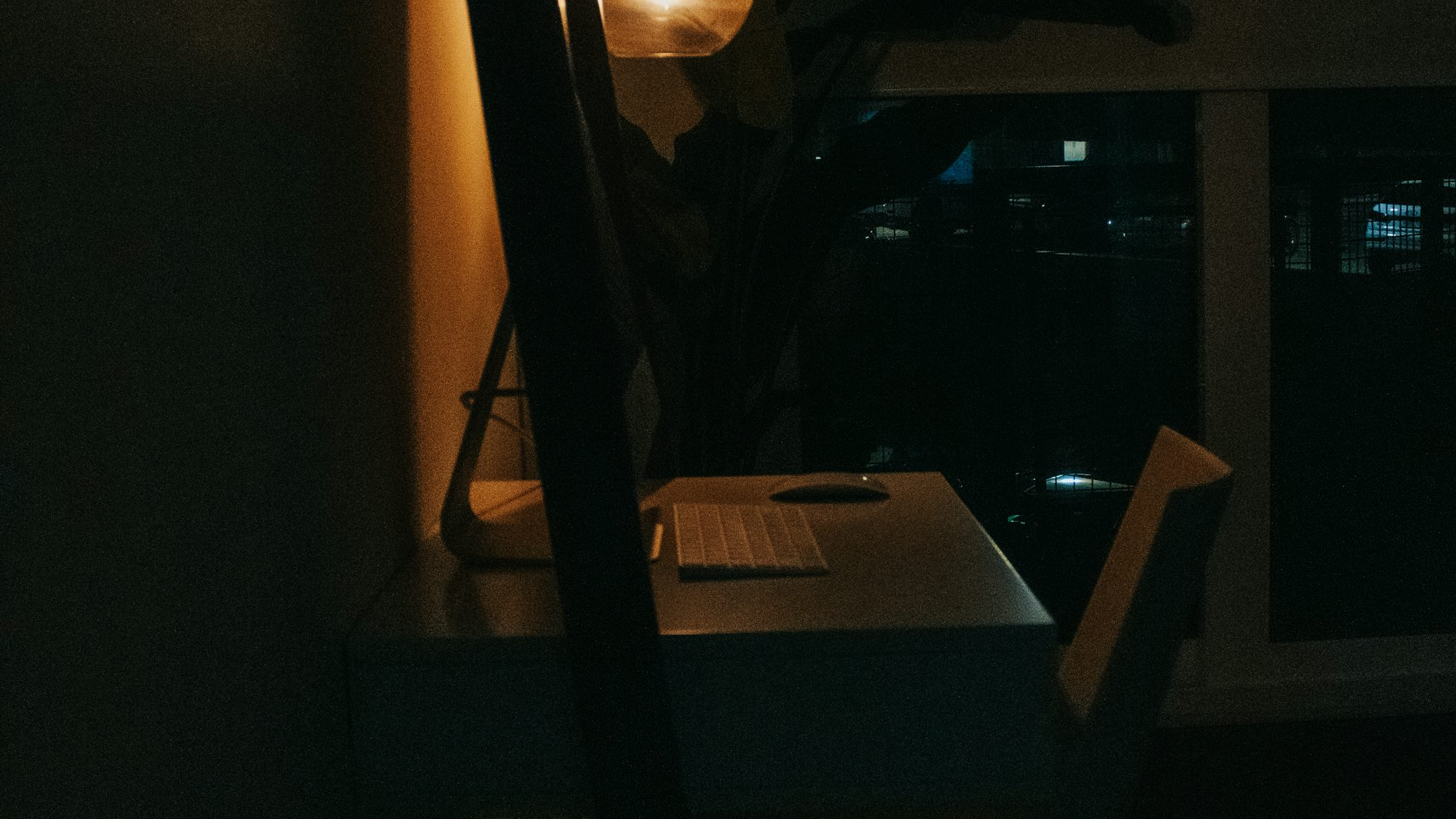 A moody, atmospheric wallpaper featuring a dimly lit room, a desk, and a single lamp providing a warm glow. Perfect for a calming and productive atmosphere.