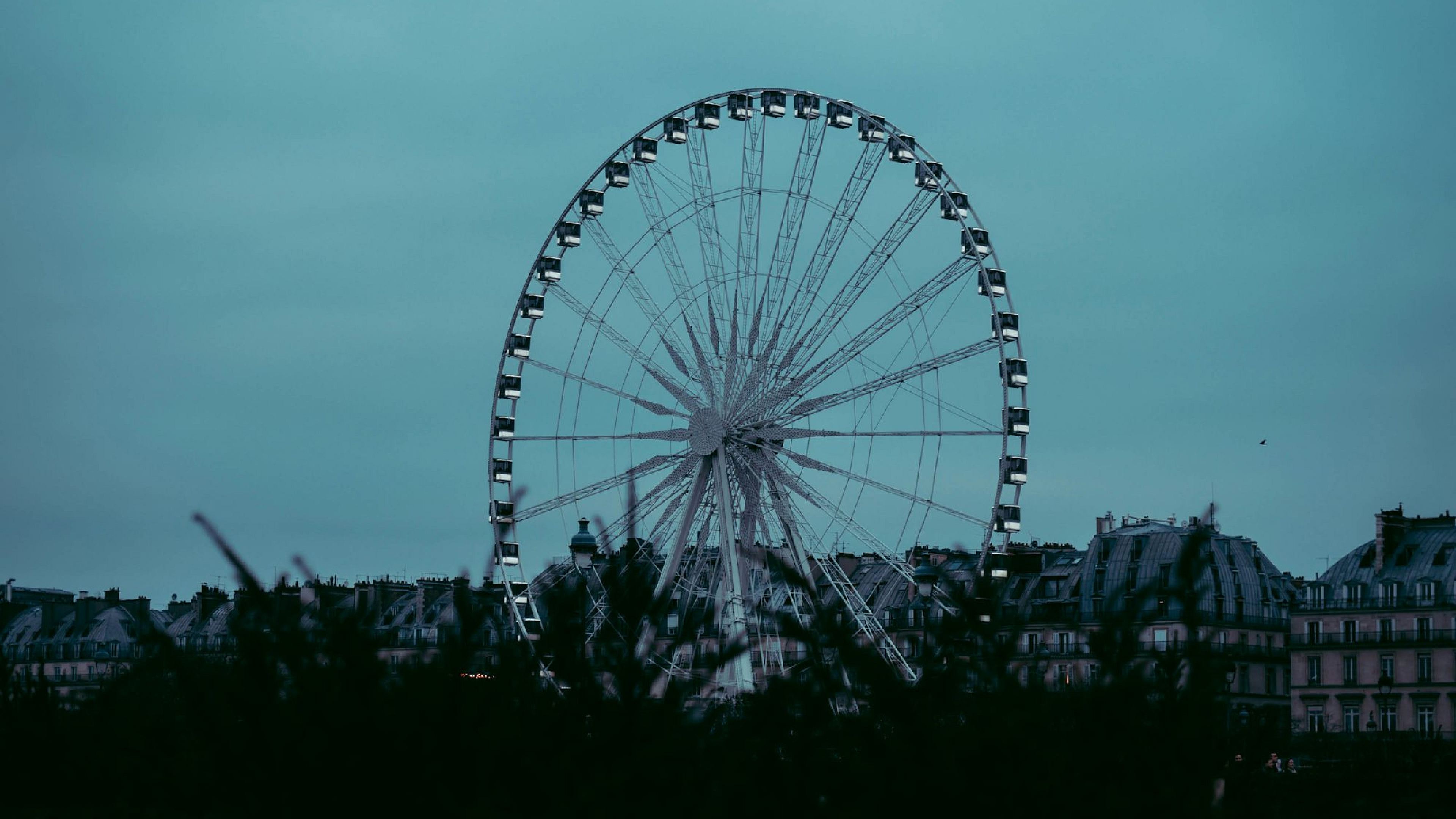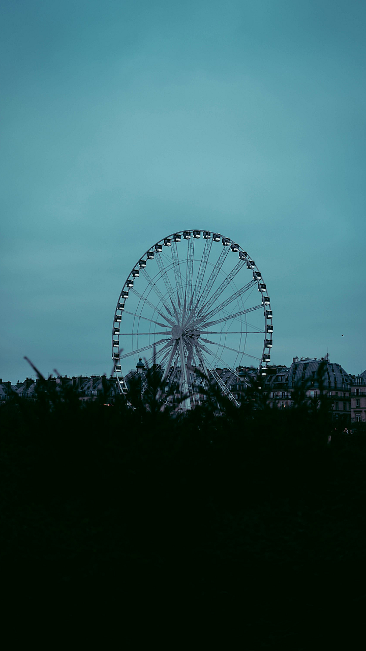 A large Ferris wheel stands majestically in the middle of a vast, open field, under a breathtaking sky. A perfect blend of nature and man-made wonder.