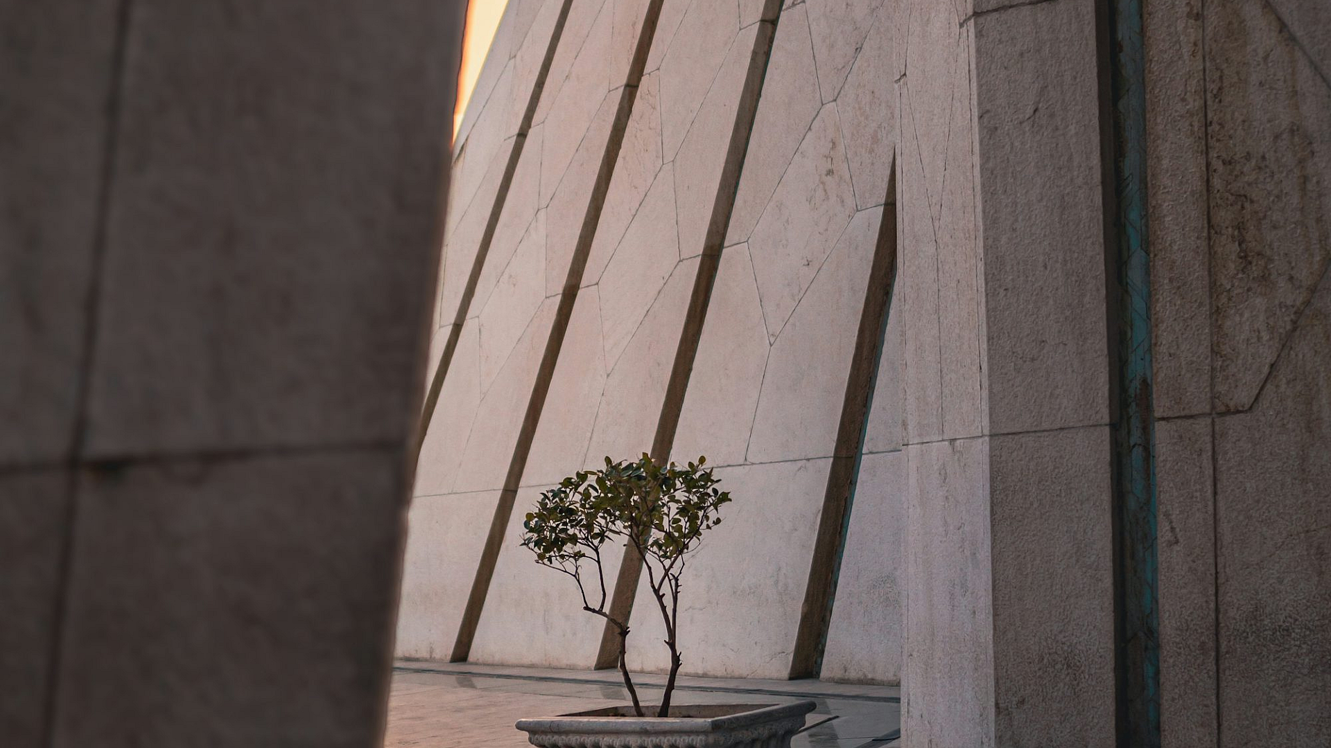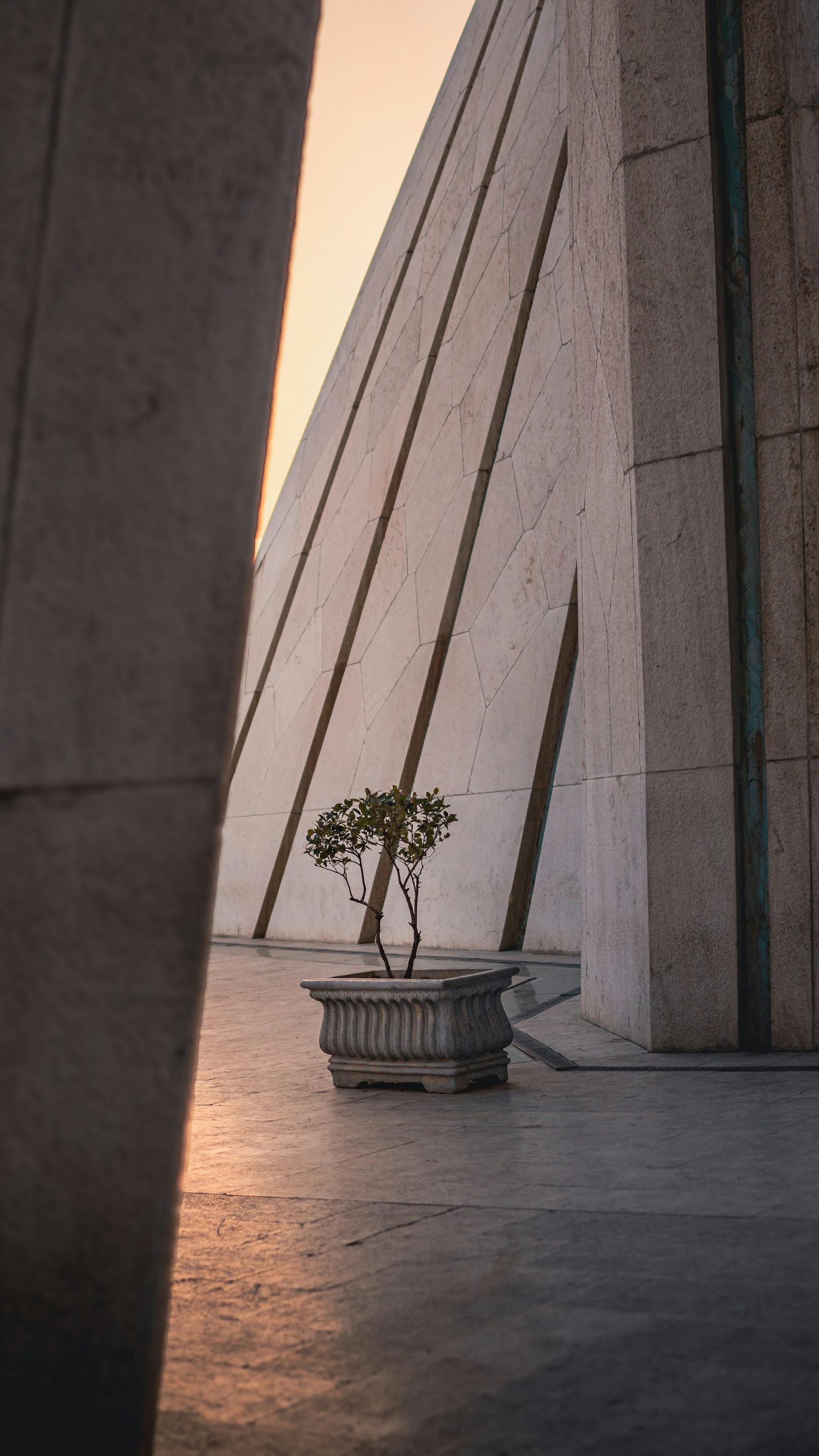 A serene potted plant contrasts sharply against the imposing backdrop of a tall building, creating a captivating image perfect for your desktop or phone wallpaper.