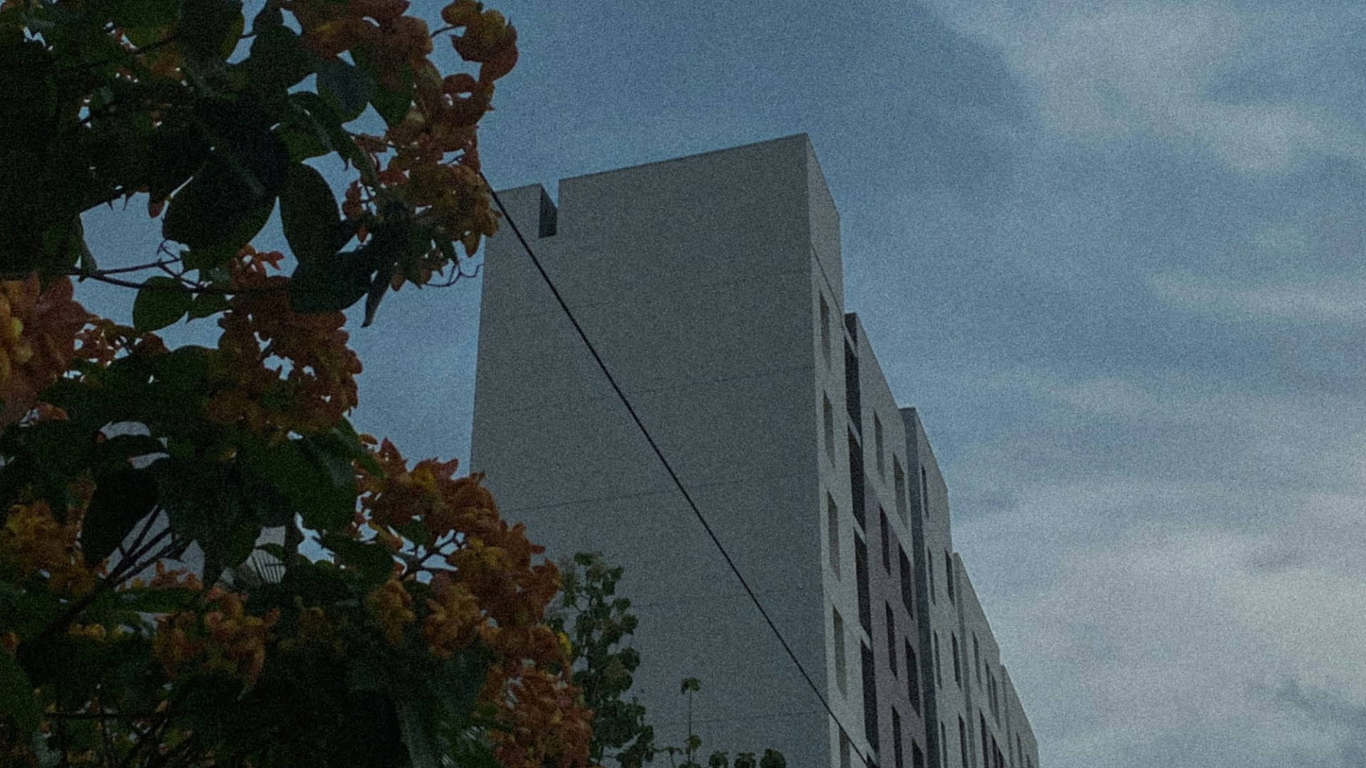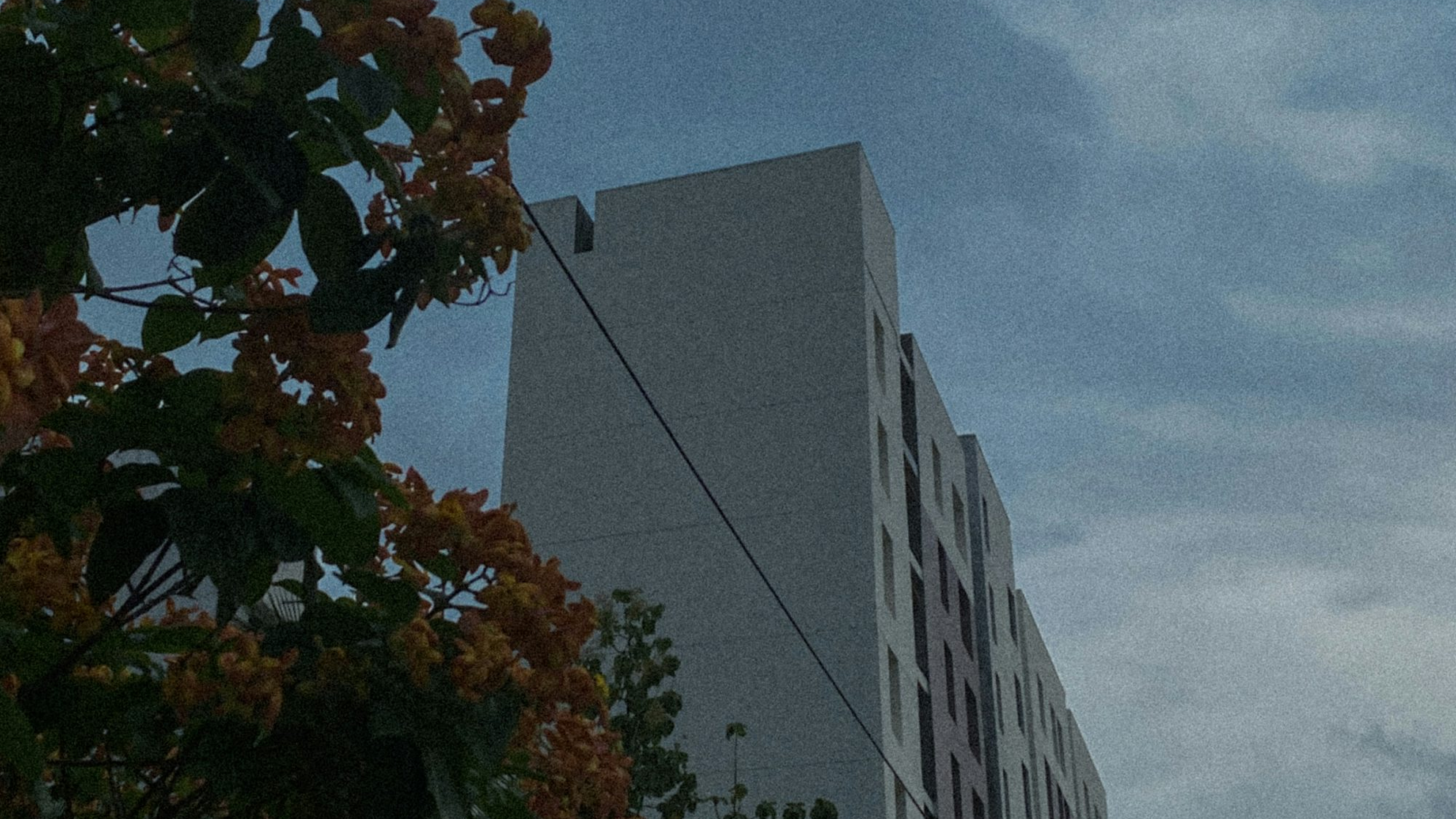 Wallpaper A Tall White Building Beside a Lush Green Forest