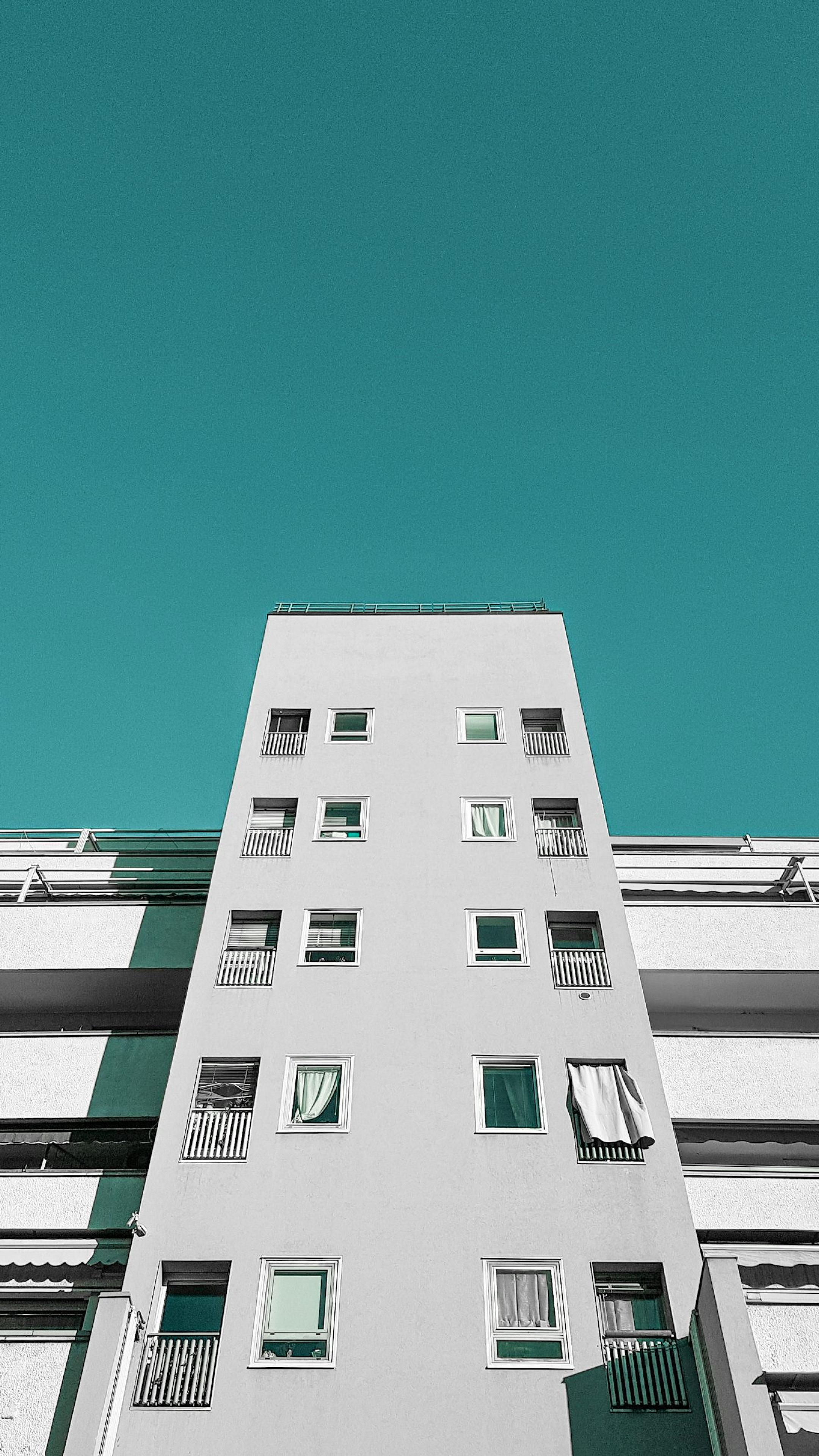 This wallpaper features a stunning image of a tall, white building with numerous balconies and windows, offering a clean and modern aesthetic.