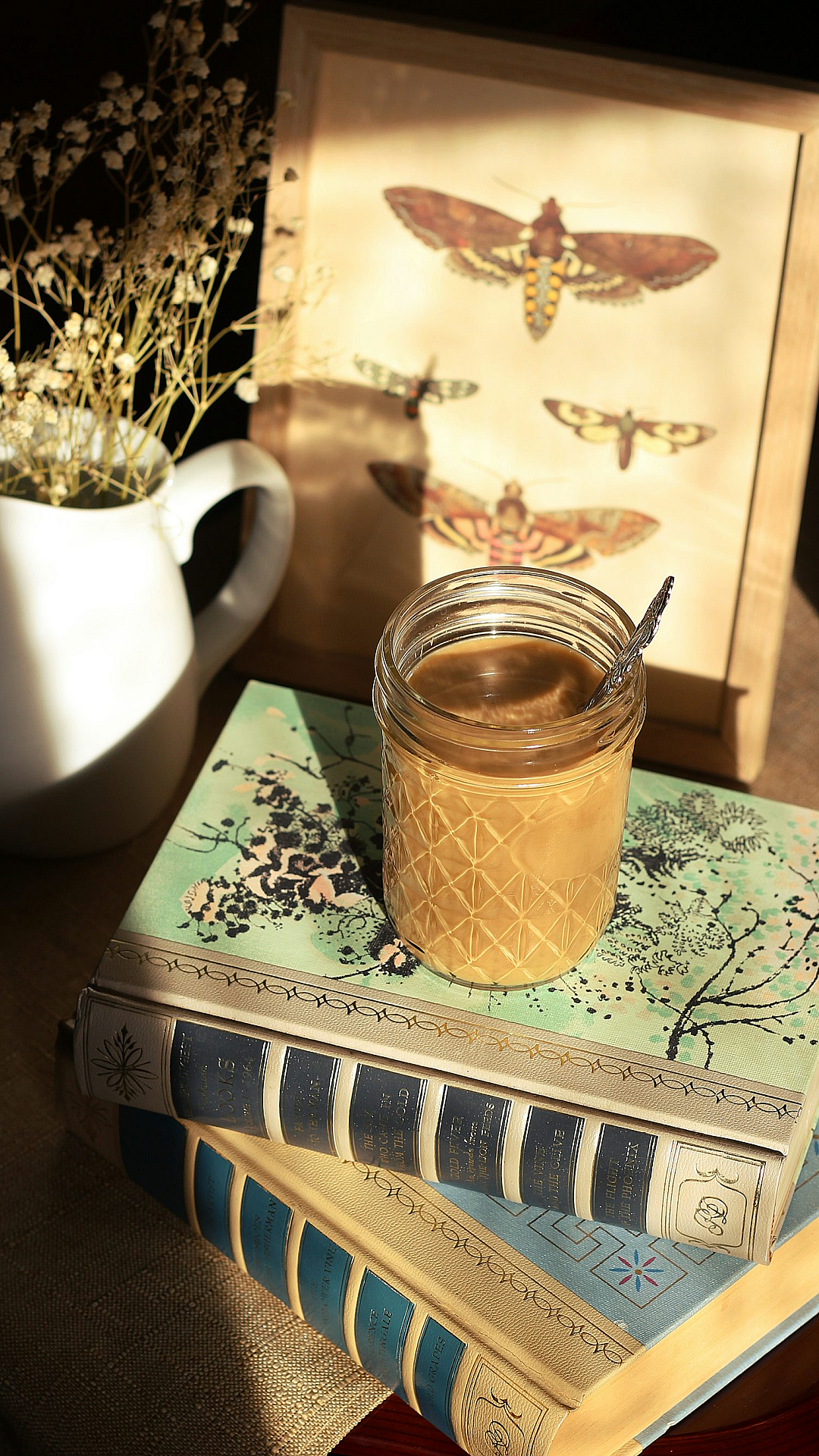 A simple yet elegant wallpaper featuring a clear glass jar resting on a stack of white and green books. Perfect for a minimalist aesthetic.