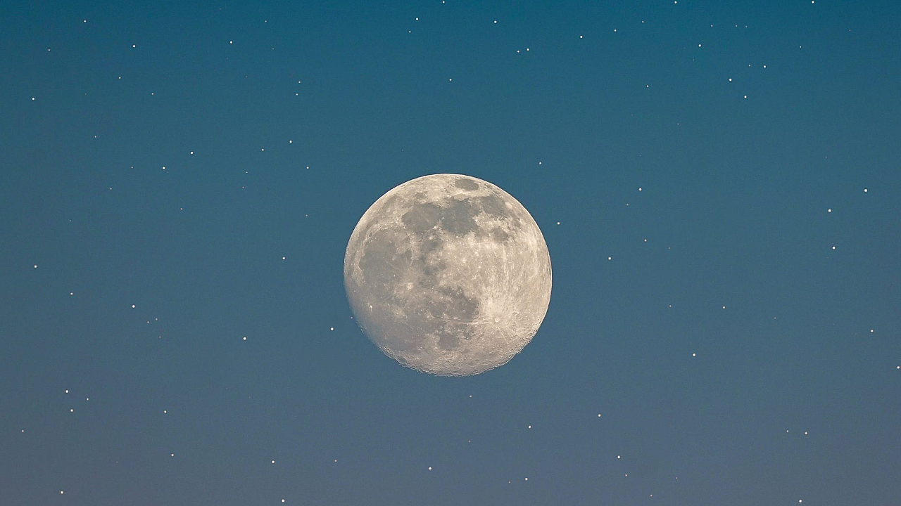 A breathtaking view of a full moon shining brightly in the night sky. Perfect for your desktop or mobile background.