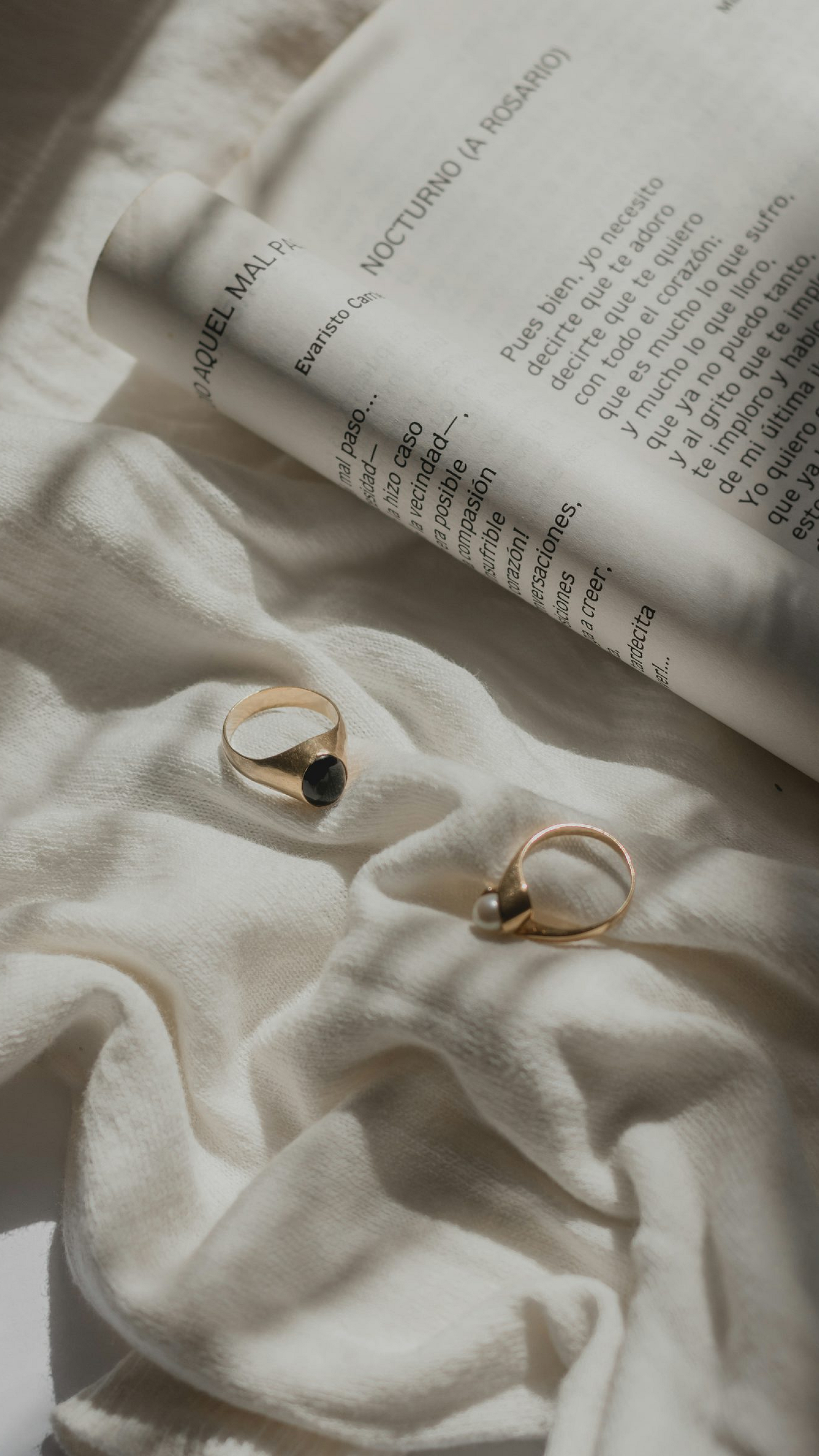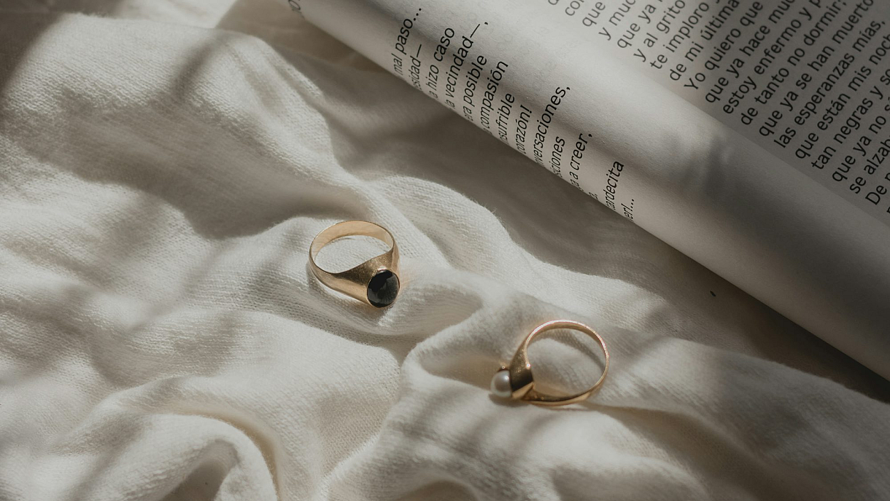 A captivating image featuring gold-colored rings resting near an open book, evoking a sense of luxury and wisdom.