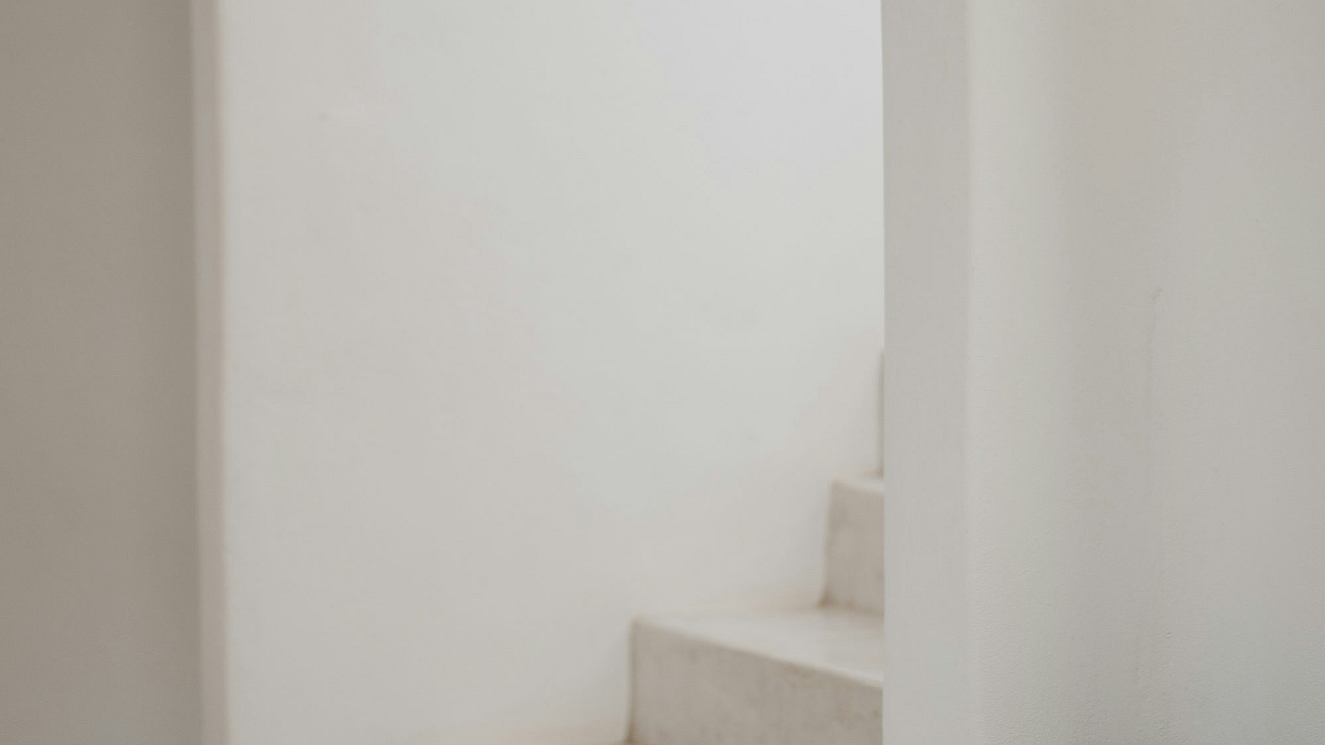 A simple yet elegant wallpaper featuring a gray wicker basket resting beside a staircase. The image offers a tranquil and inviting aesthetic perfect for various home decor styles.