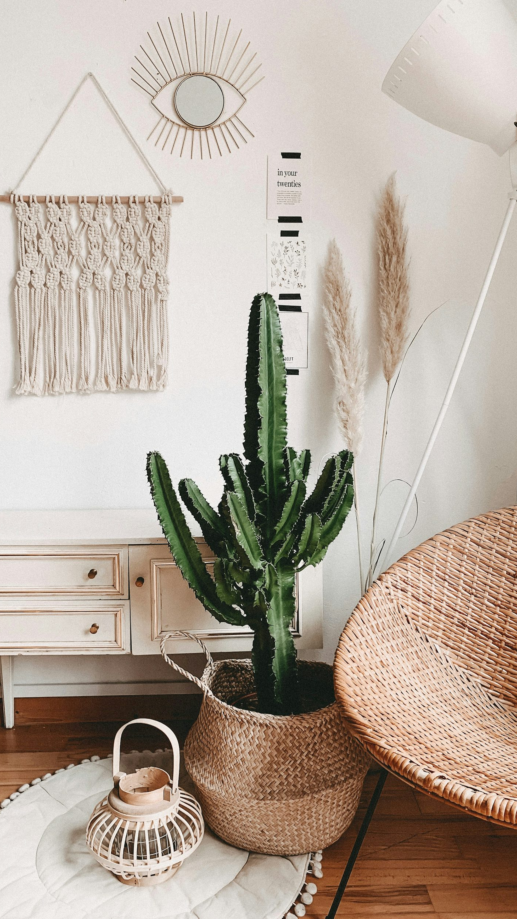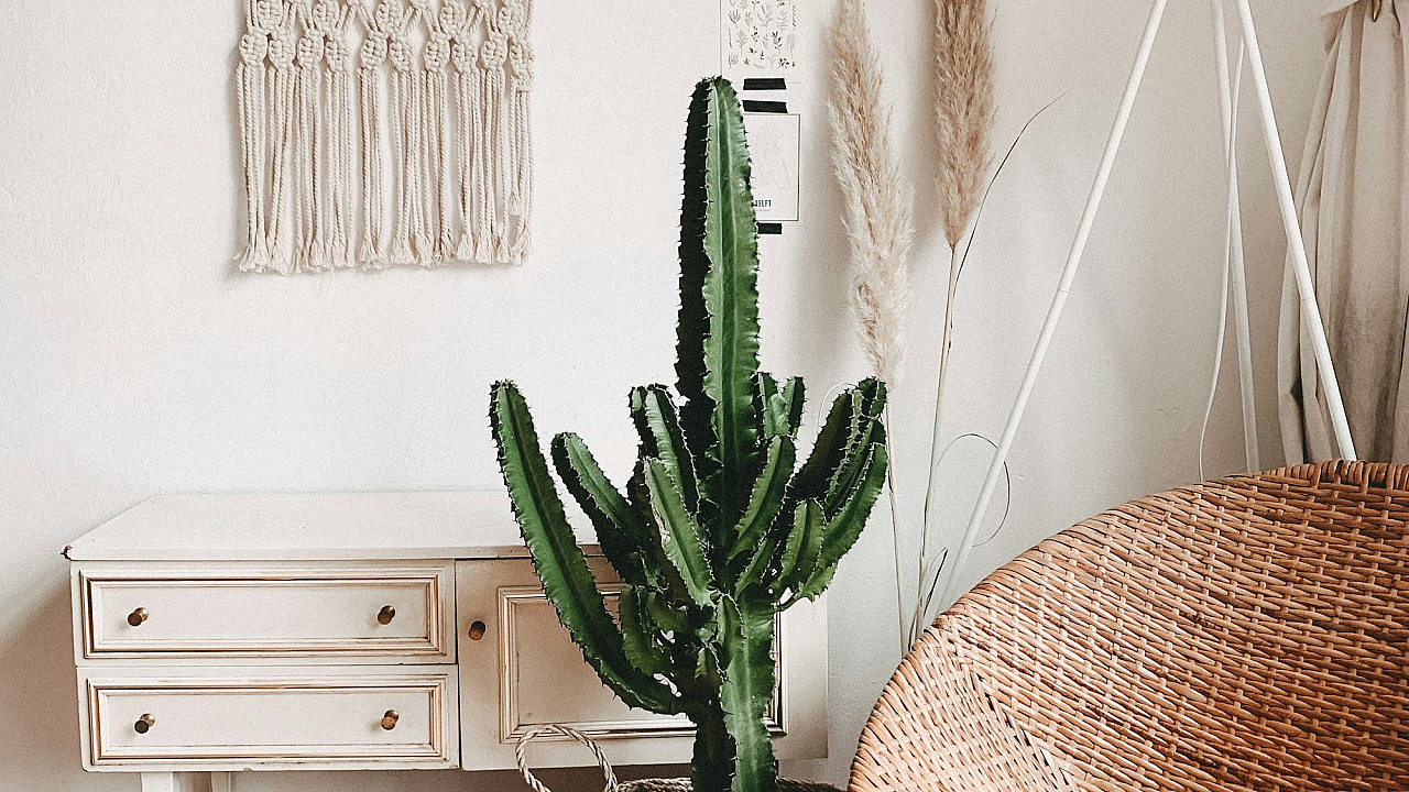 A calming and minimalist wallpaper featuring a vibrant green cactus plant in a serene room setting. Perfect for adding a touch of nature to your digital space.