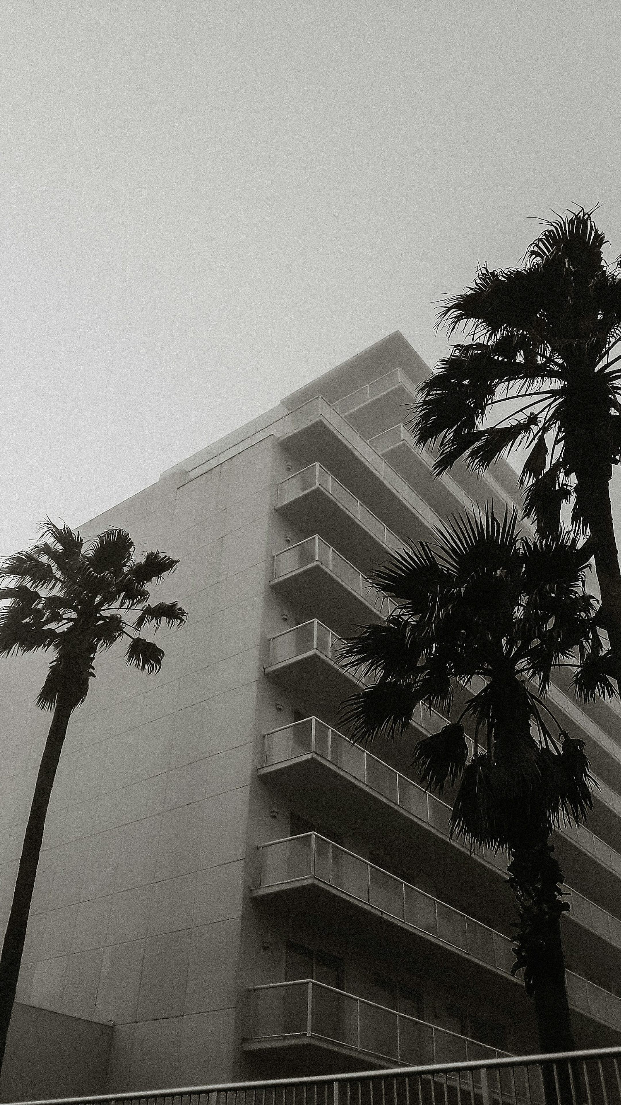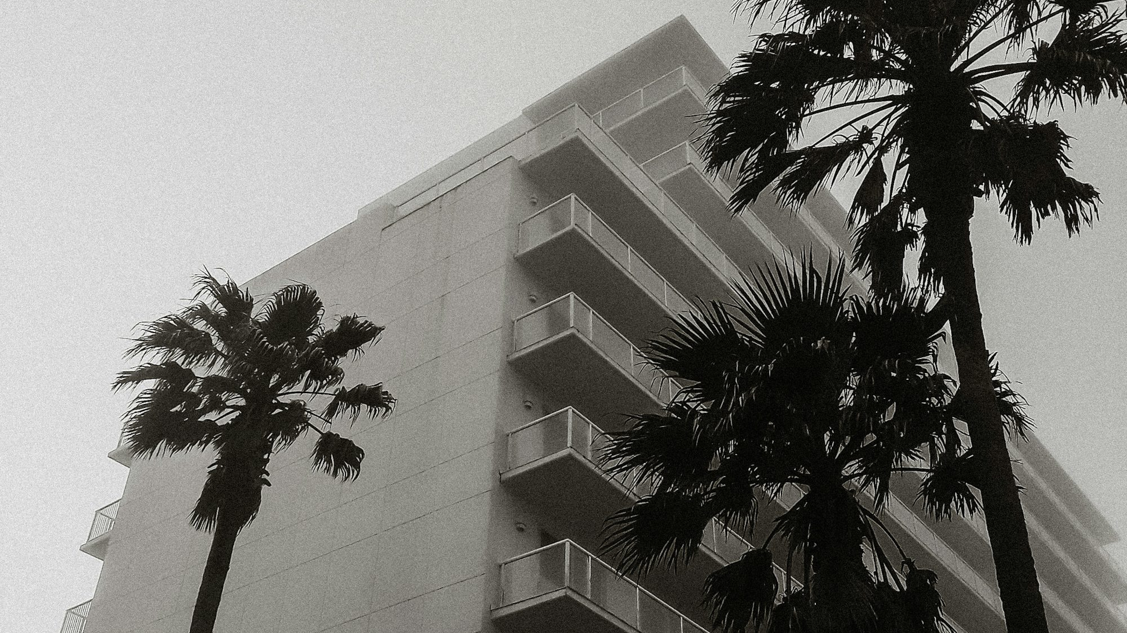 greyscale, palm tree, building, monochrome, photography, wallpaper, architecture, tropical, urban, nature