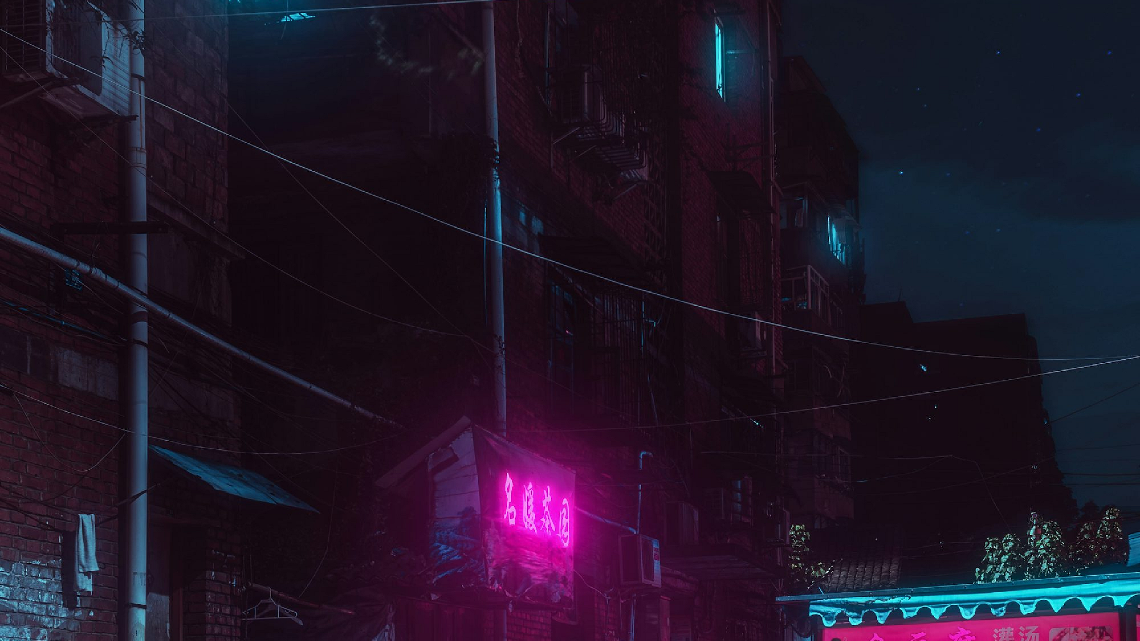 This wallpaper features a captivating scene of a brightly lit store next to a building at night, creating a striking contrast against the darker surroundings. Perfect for a desktop or mobile background.
