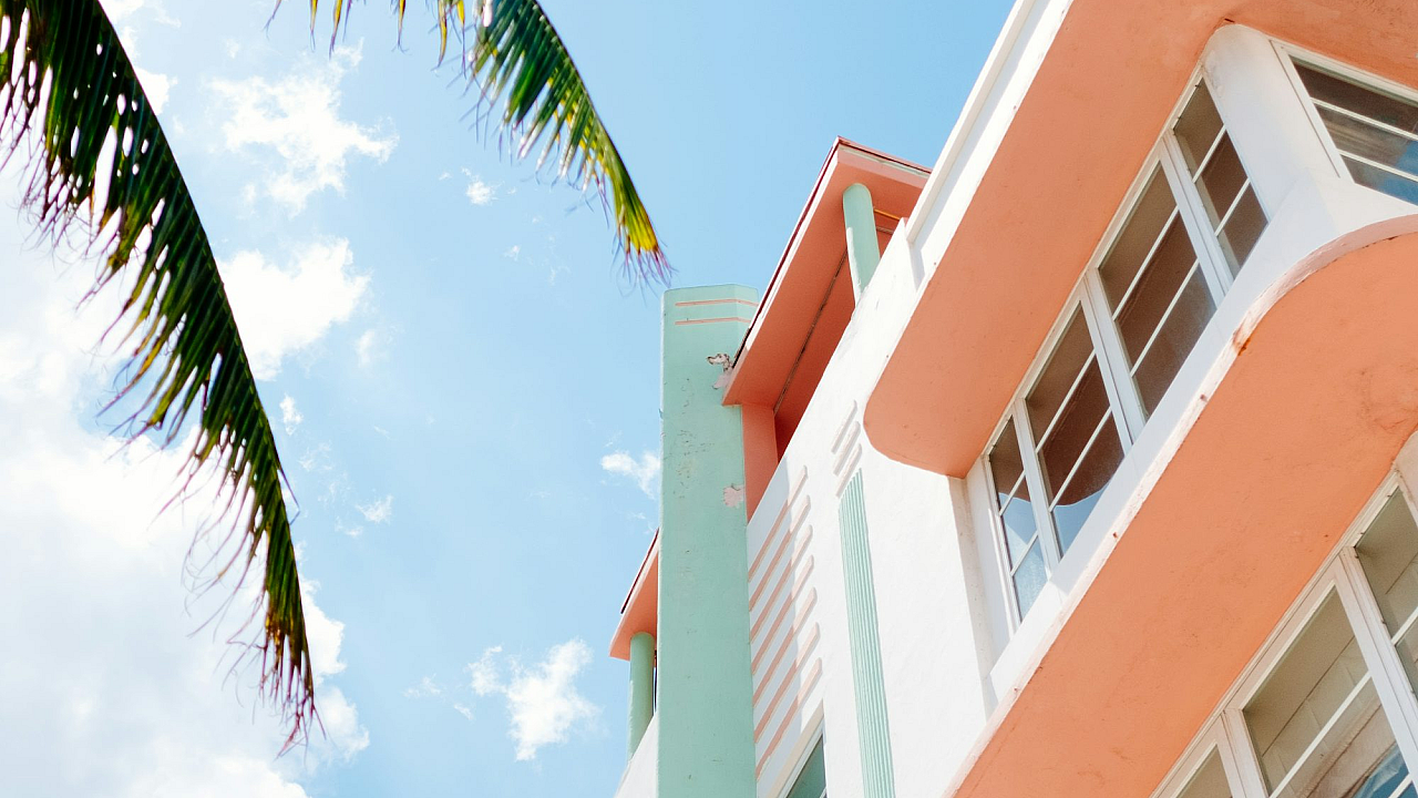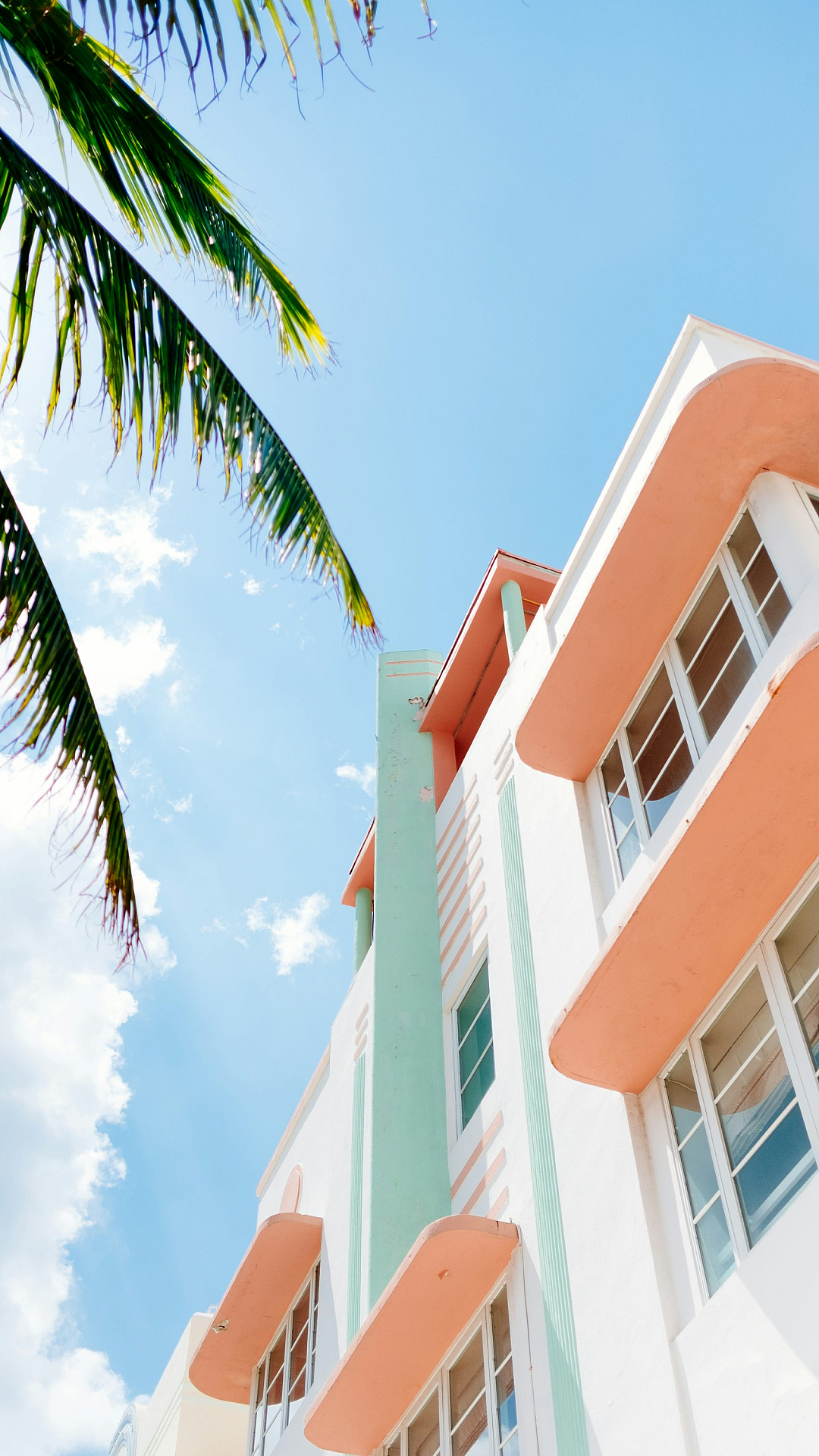 A stunning low-angle shot showcasing a striking white and orange concrete building. Bold colors and sharp lines create a visually impactful wallpaper.
