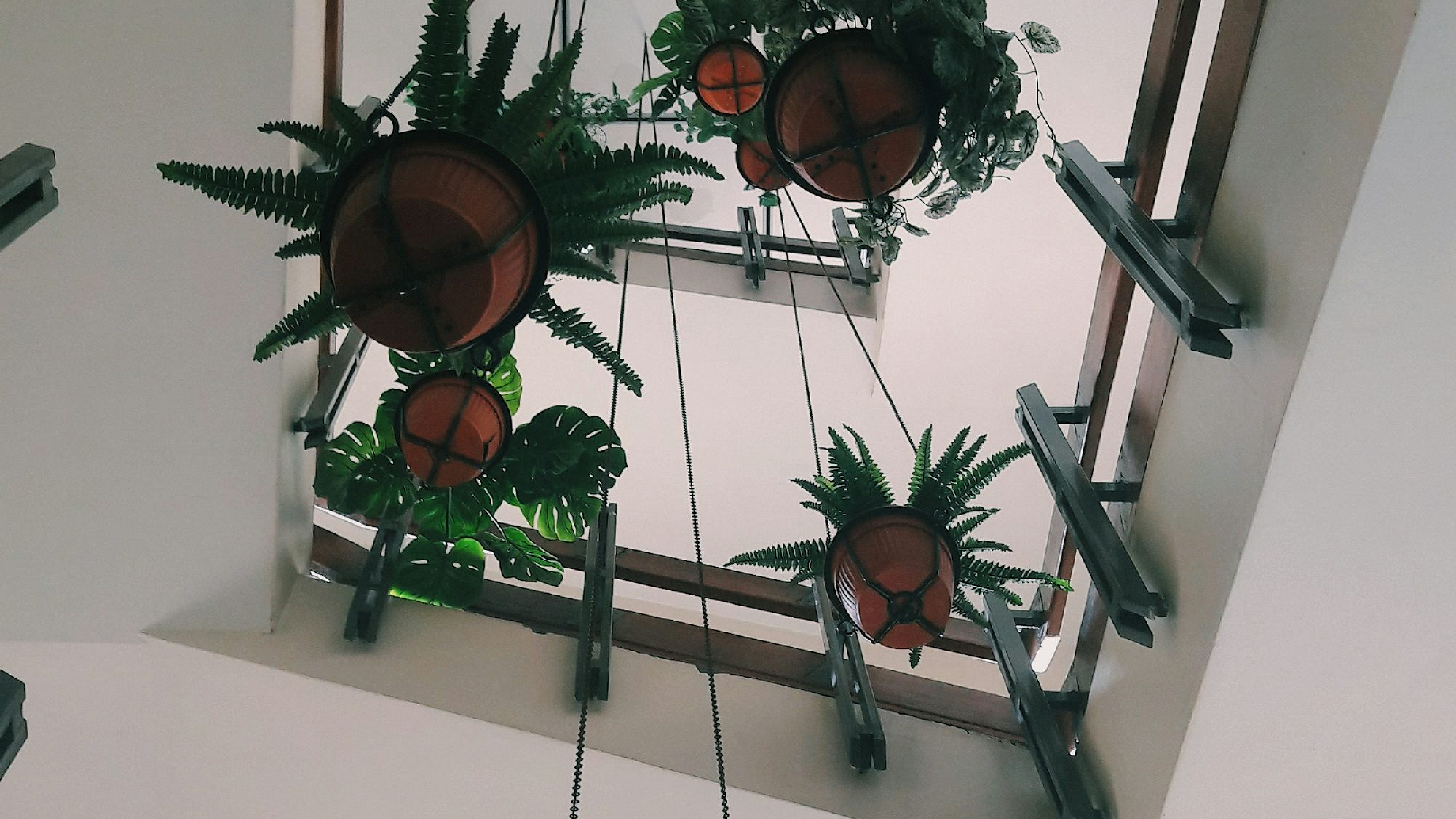 low angle, hanging plants, plant pots, ceiling, photography, wallpaper, green, nature, indoor plants, home decor