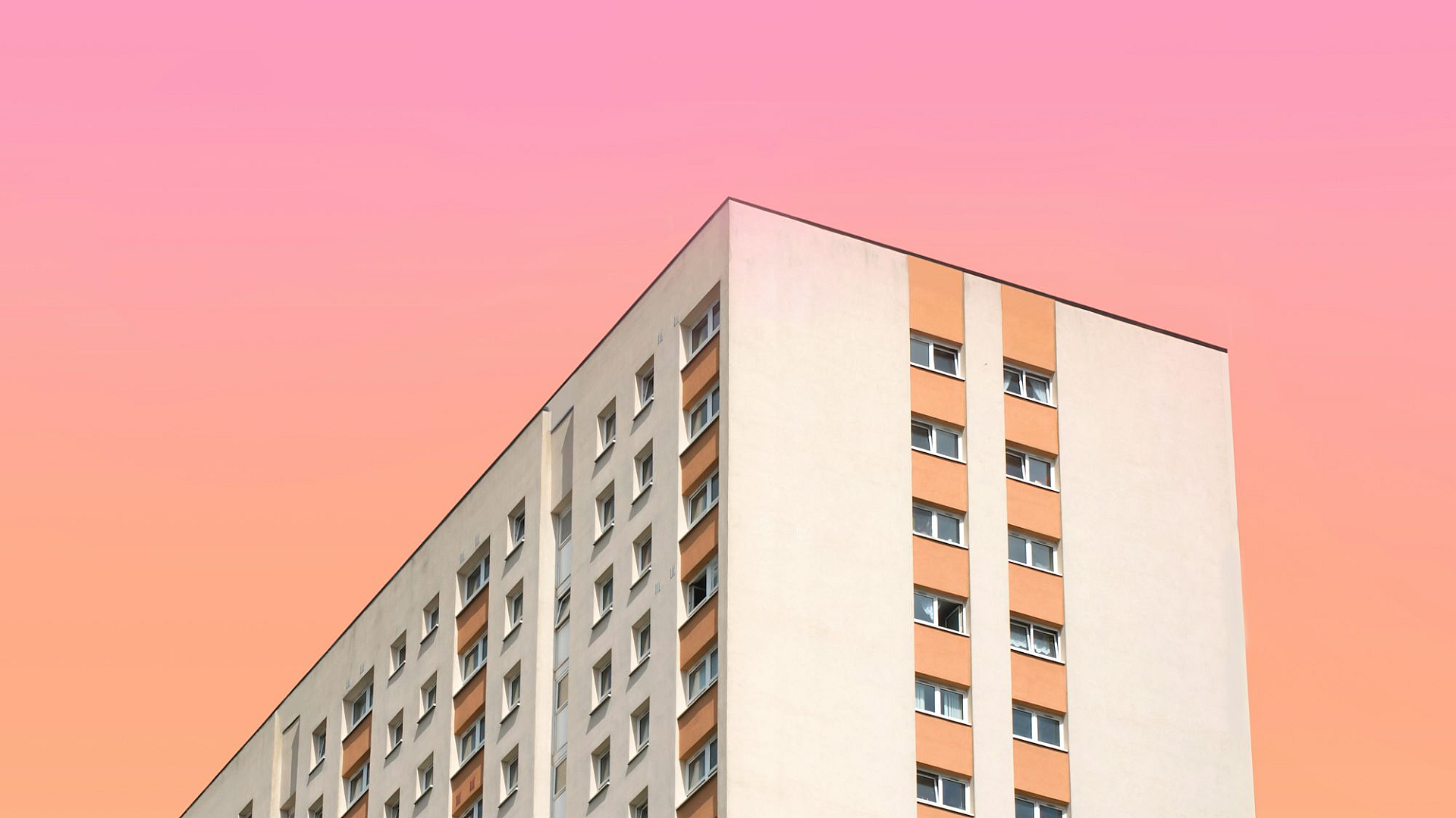 This wallpaper features a striking low-angle shot of a white and brown concrete building, showcasing its texture and architectural details. A perfect blend of modern and urban aesthetics.