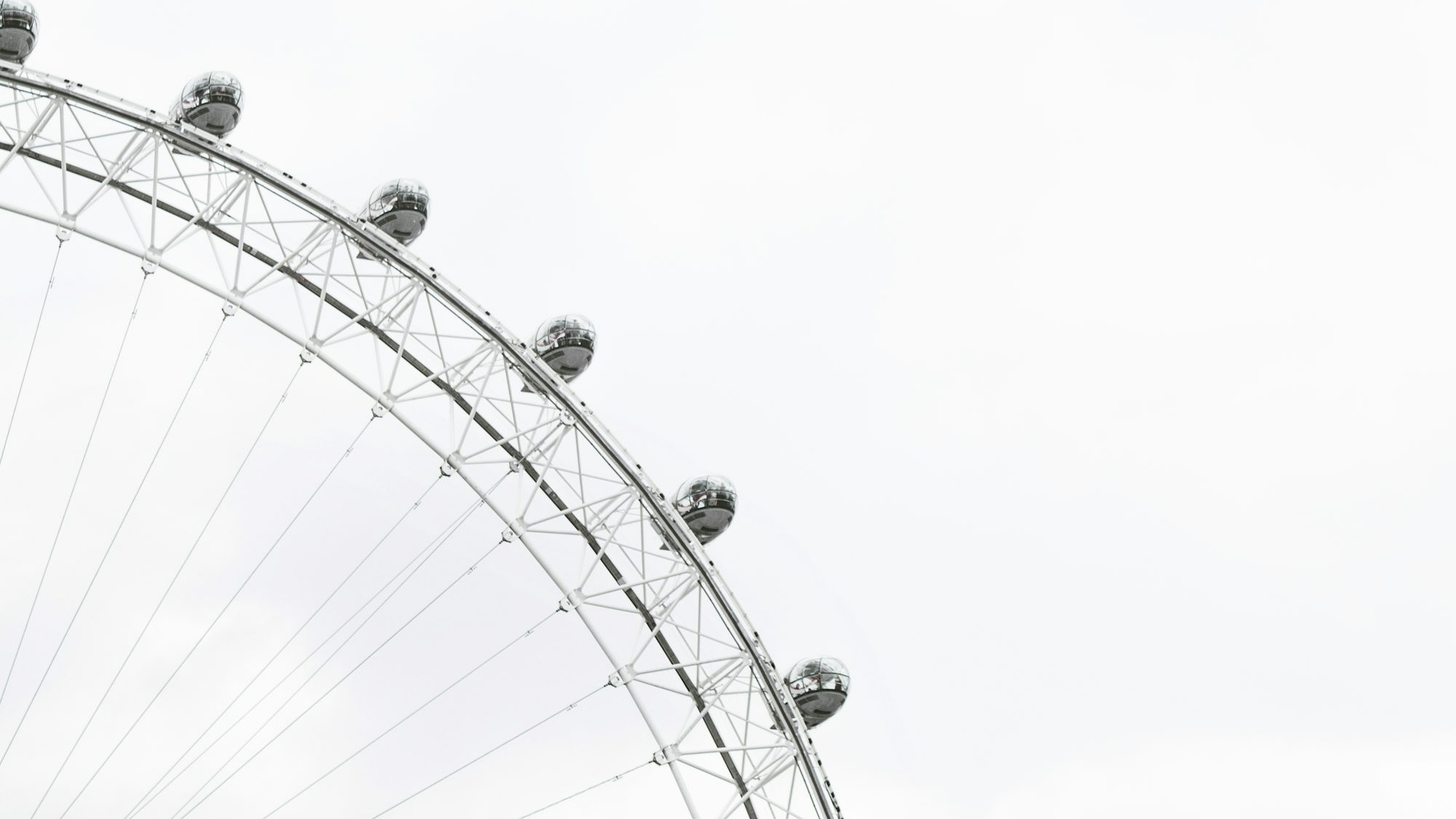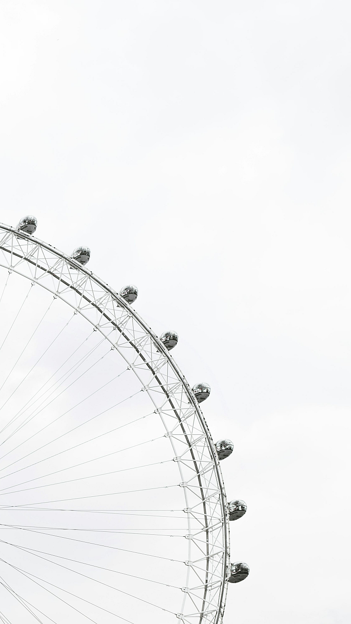 A captivating wallpaper featuring a section of a Ferris wheel with enclosed passenger cars against a moody, overcast sky. People are visible inside the cars, enjoying the ride.