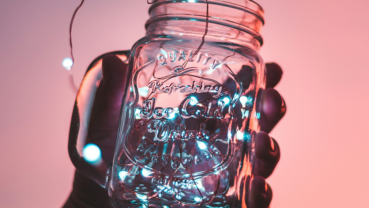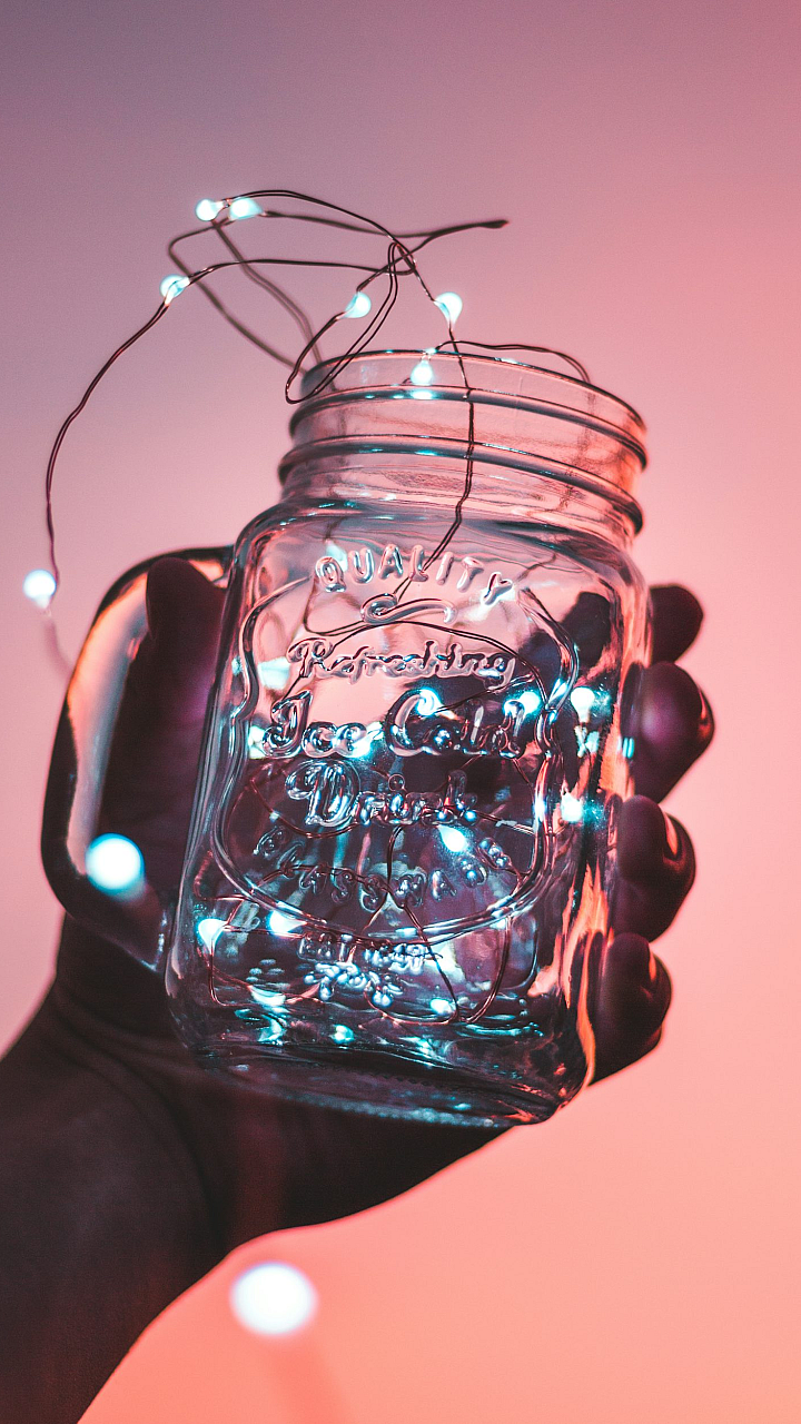 A captivating wallpaper featuring a person gently holding a clear mason jar illuminated from within by warm strip lights. The soft glow creates a mesmerizing effect.