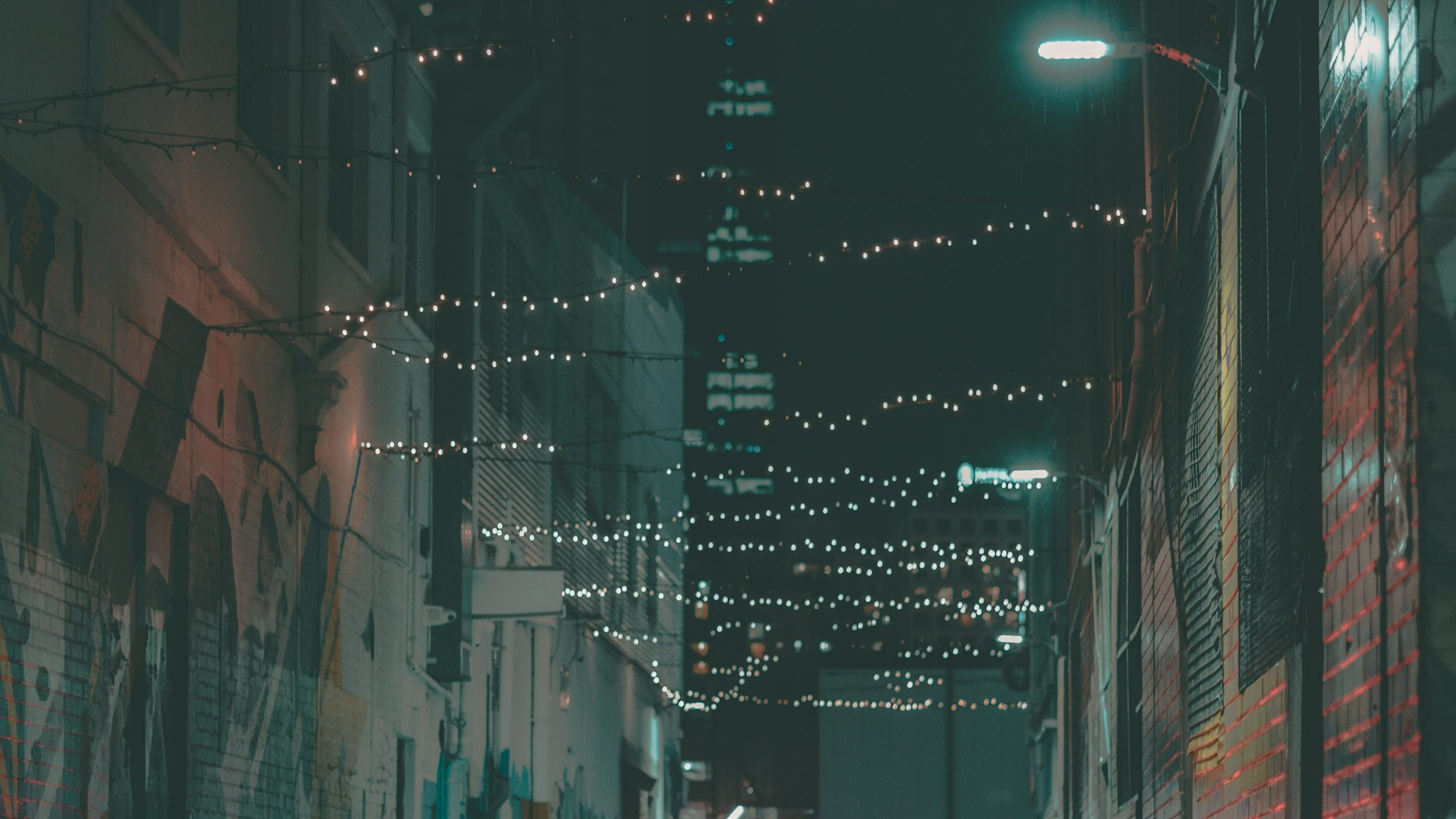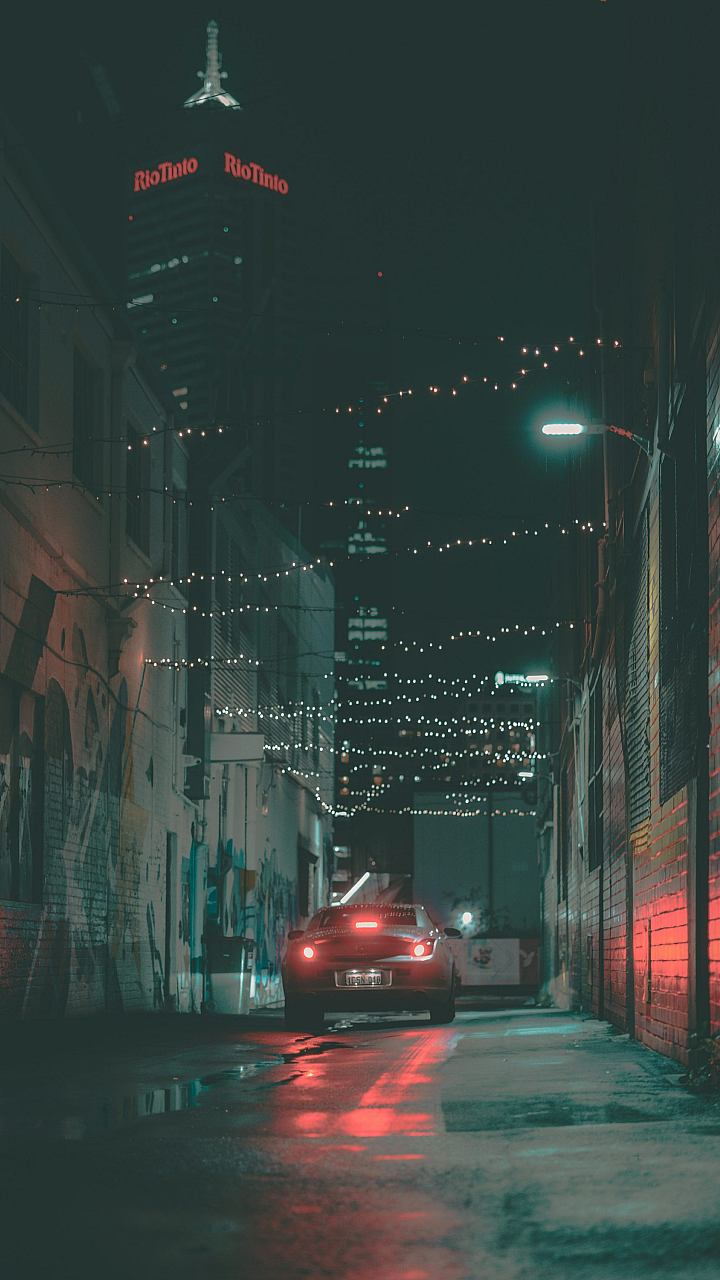 A stunning wallpaper featuring a red car driving down a road at night. The image is dark and moody, with the car’s headlights cutting through the darkness.