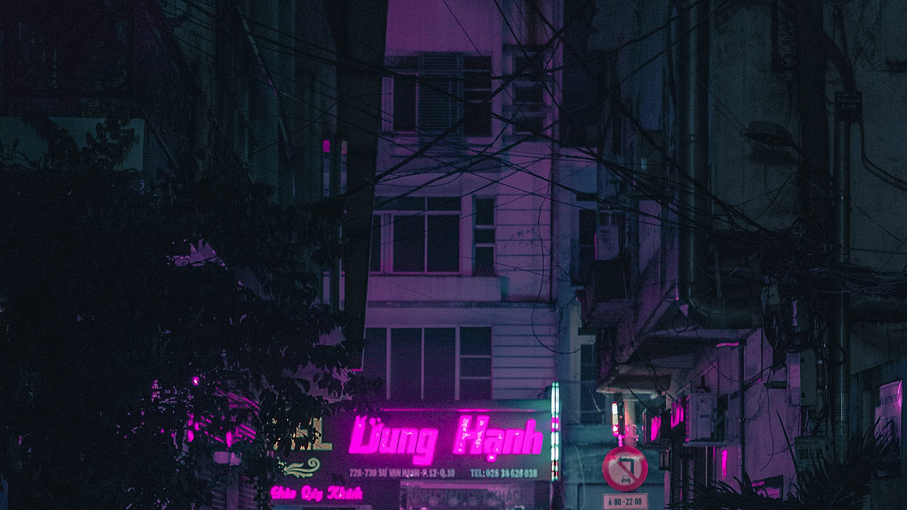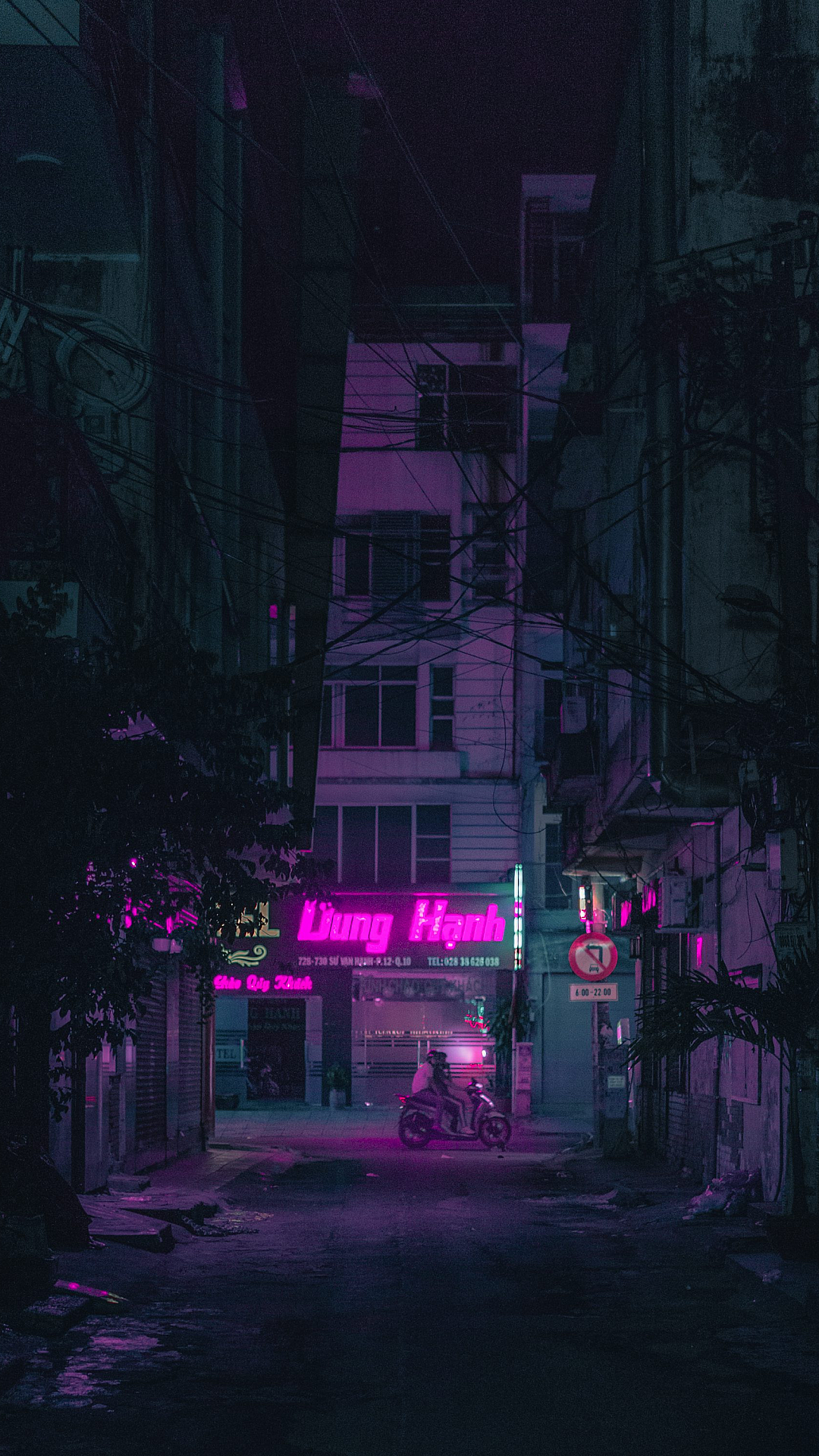 A captivating wallpaper featuring a red car parked near a building at night. The scene is shrouded in darkness, creating a mysterious and alluring atmosphere.