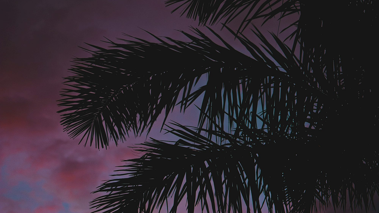 A striking silhouette of a single coconut palm tree against a vibrant sunset, perfect for a serene and tropical desktop background.