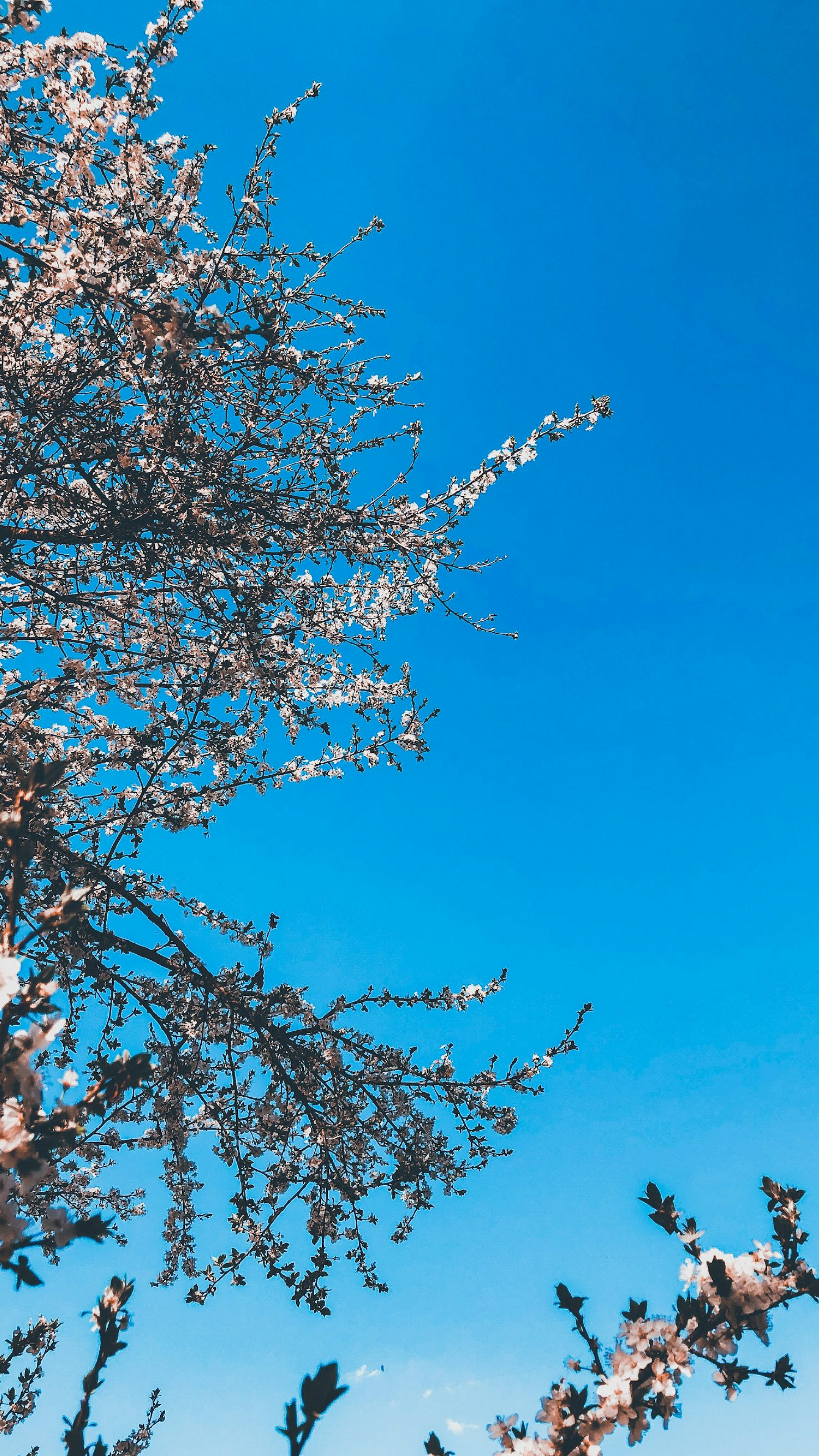 A serene wallpaper featuring a majestic tree silhouetted against a vibrant blue sky. Perfect for a calming desktop background.