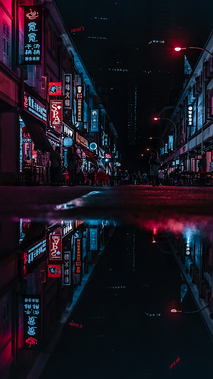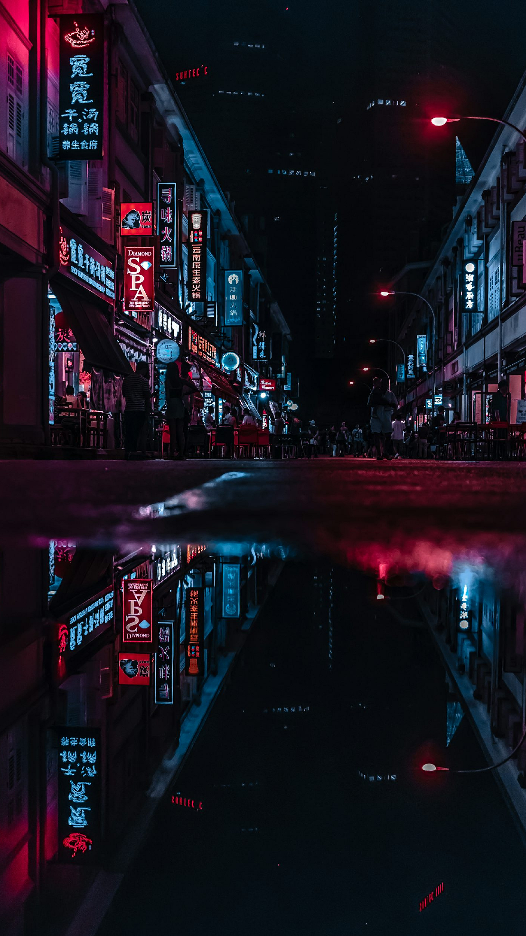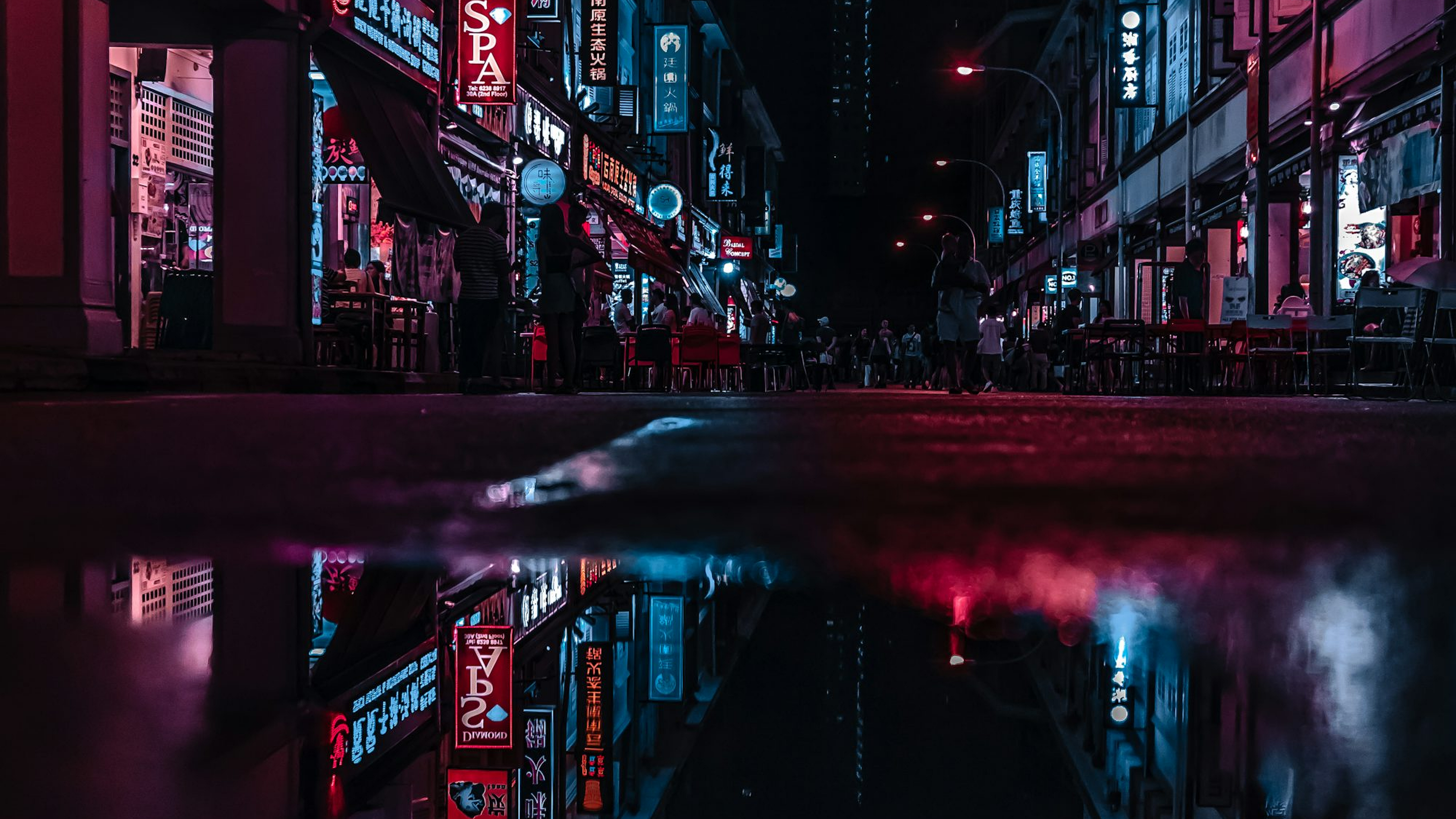 A captivating wallpaper showcasing a glistening wet street between towering buildings under the cloak of night. Reflections dance on the slick surface, creating a mysterious and beautiful scene.