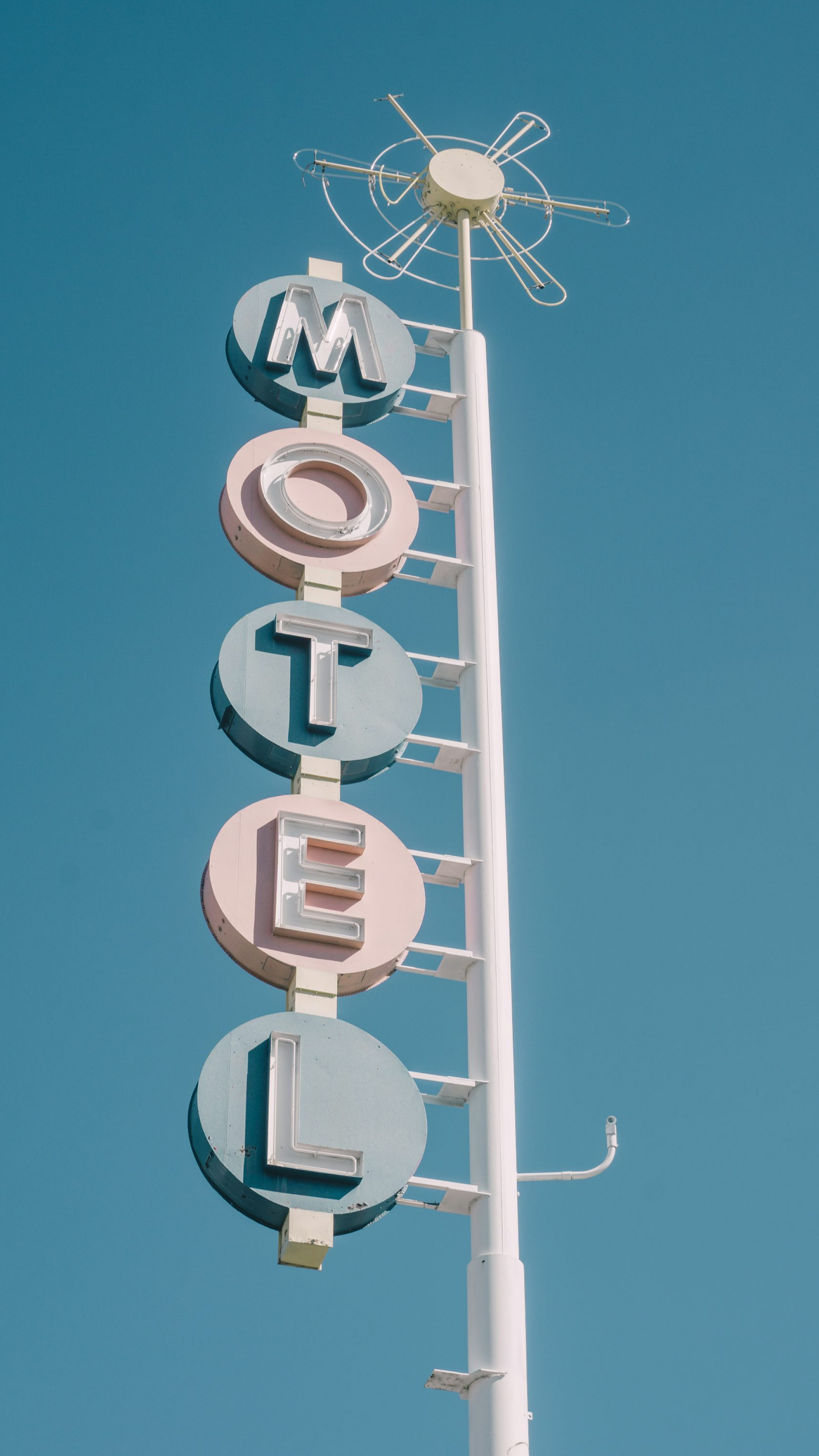white motel sign, teal motel sign, metal motel sign, vintage motel sign, retro motel sign, roadside motel sign, neon motel sign, motel wallpaper, white and teal wallpaper, metal signage wallpaper
