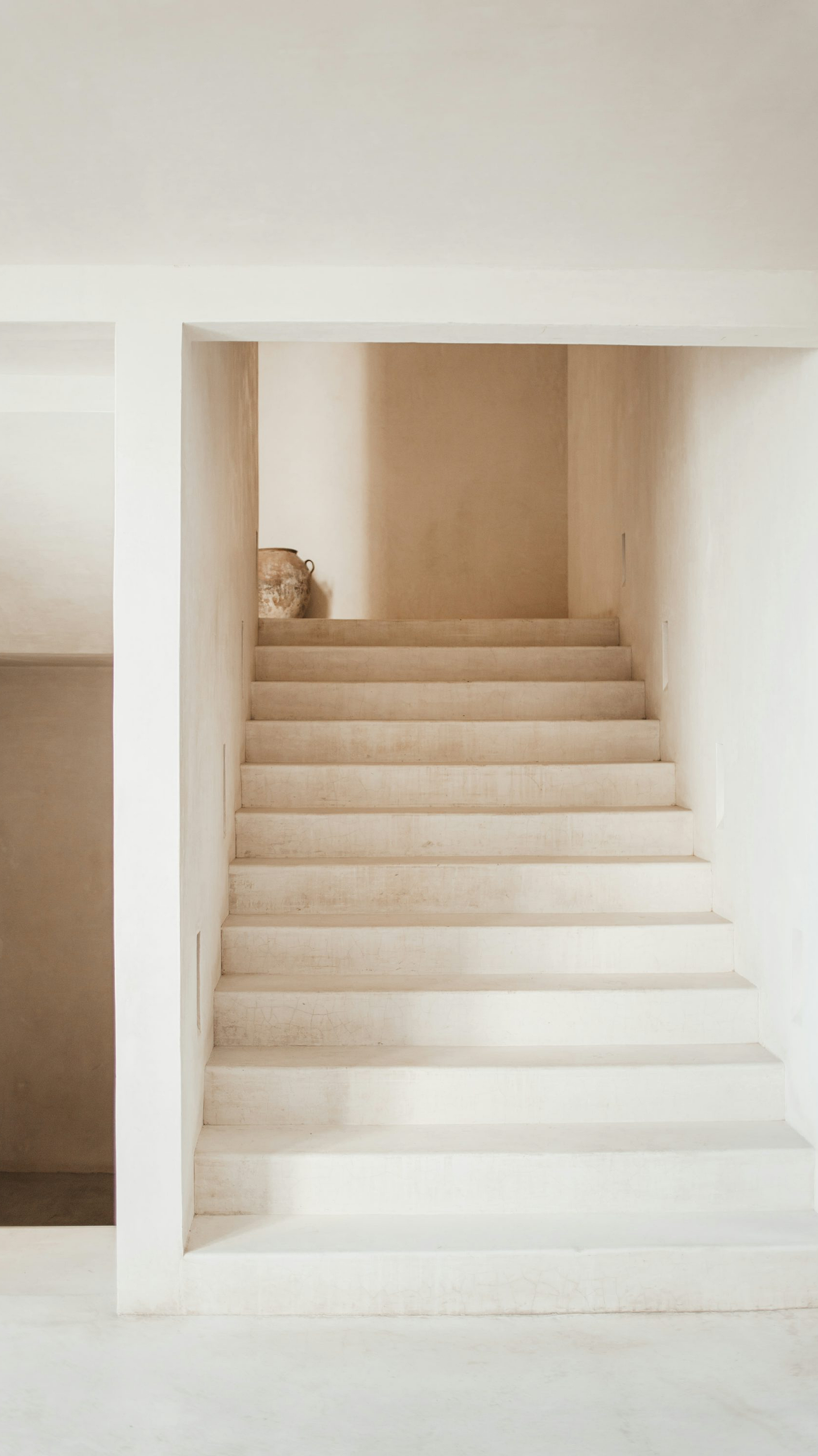 A clean and minimalist wallpaper featuring a white wooden staircase with matching white wooden railings. Perfect for adding a touch of elegance to any space.