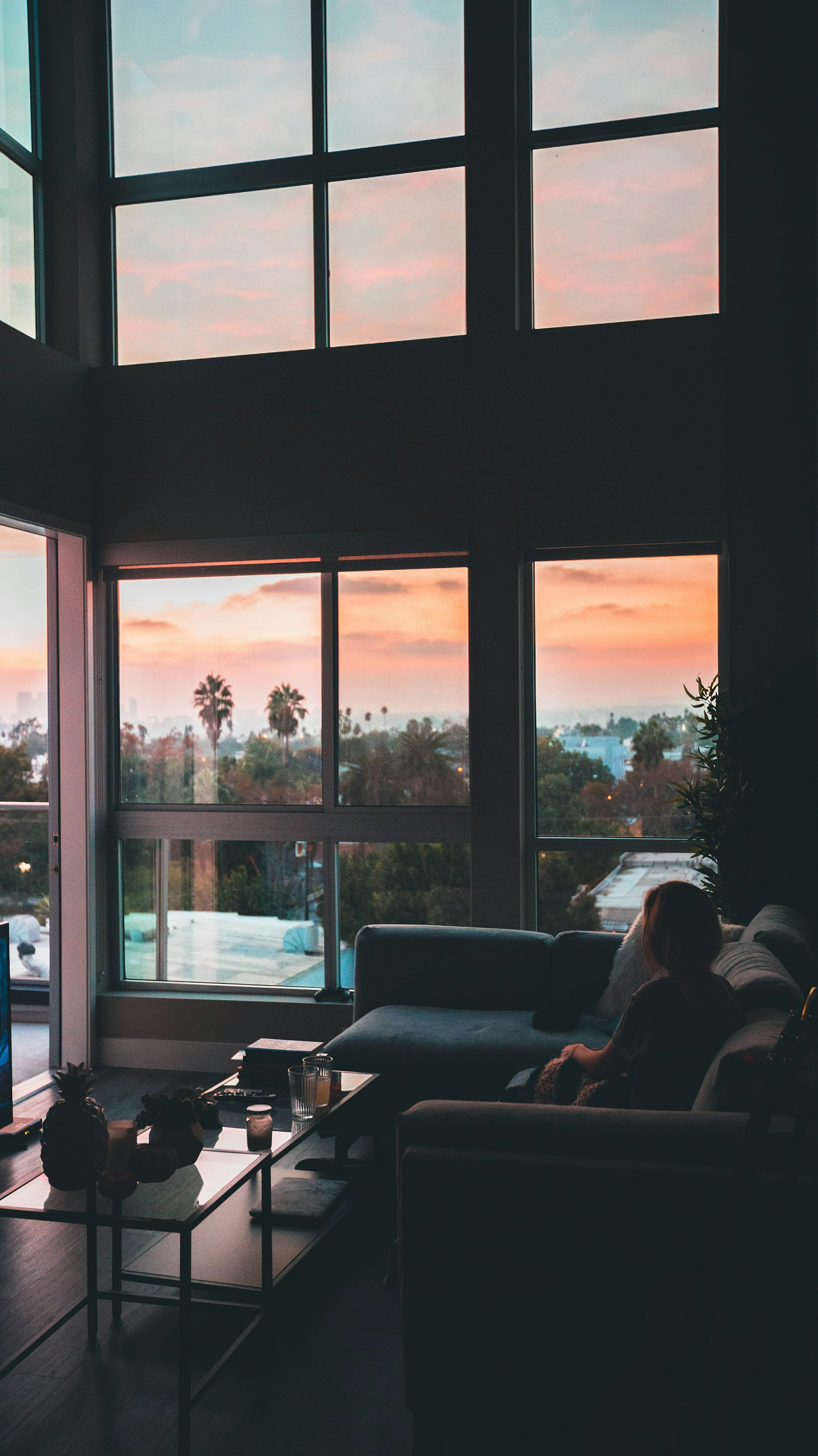 A serene image of a woman comfortably seated on a corner sofa, next to a coffee table, in a bright living room with large windows. Perfect for a calming desktop or phone background.